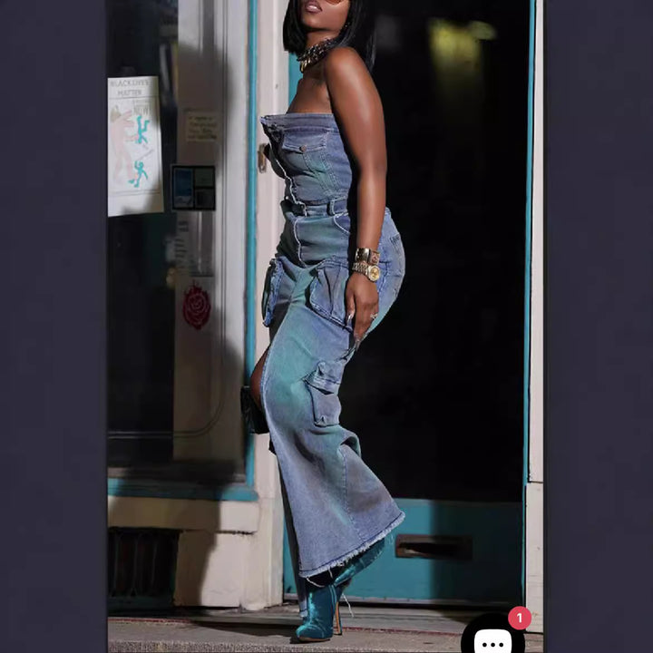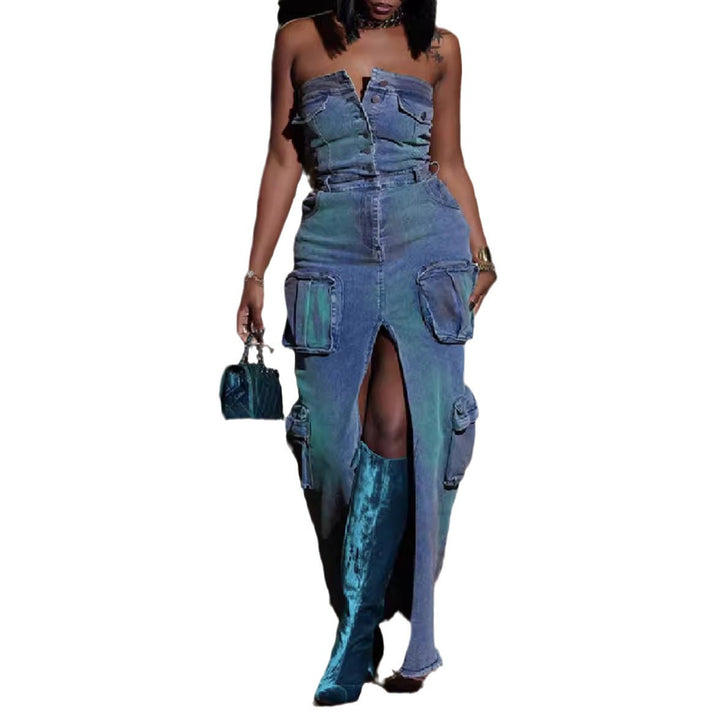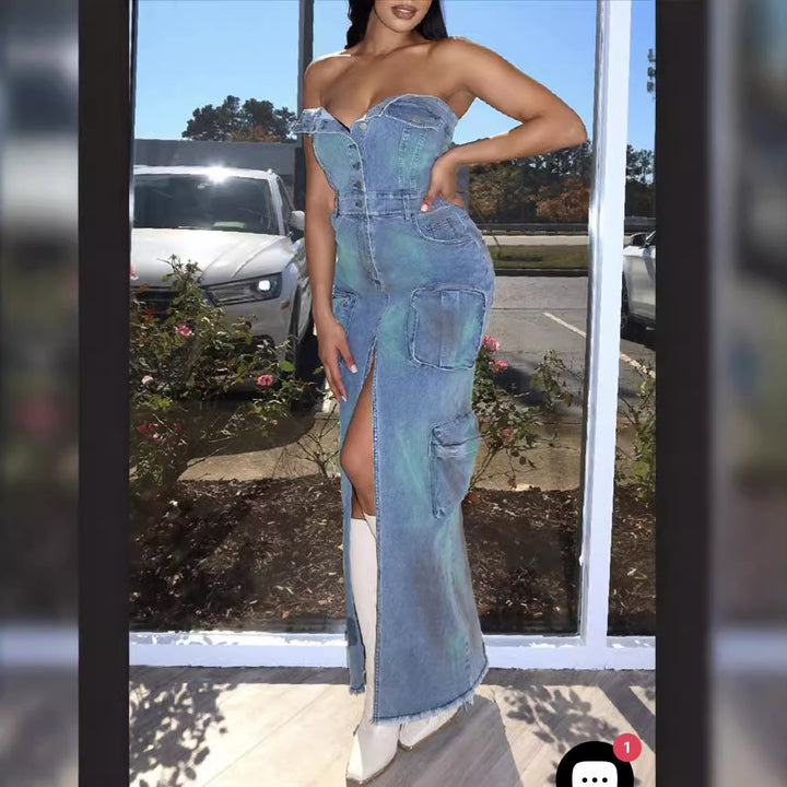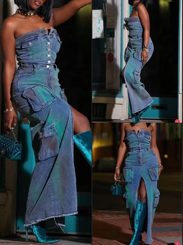 Foreign trade Europe and the United States new sexy tube top waist front split hip wrap heavy industry denim dress women