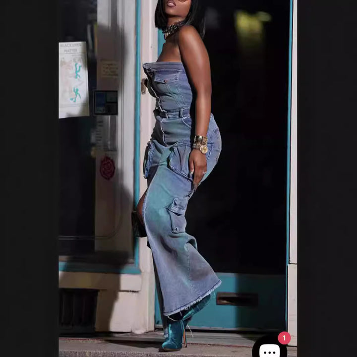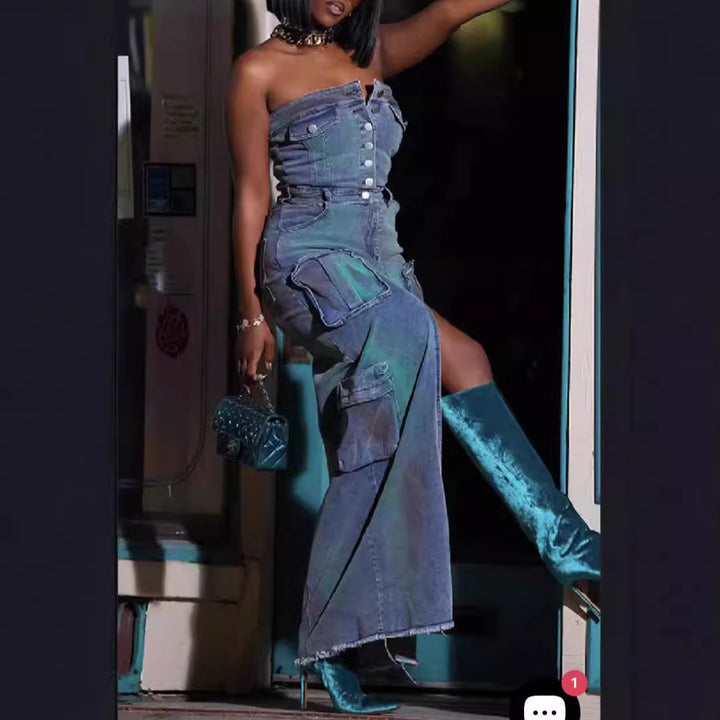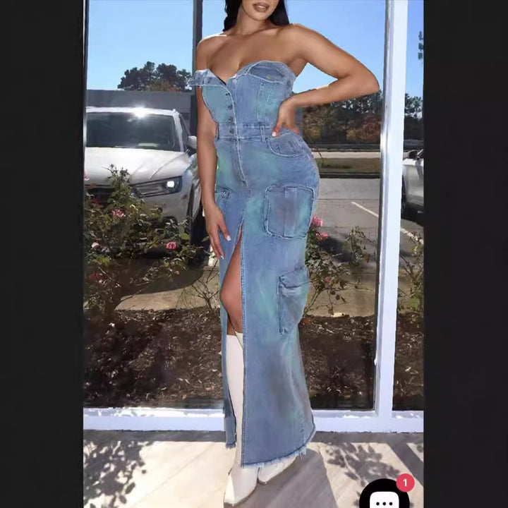 Foreign trade European and American new personalized sexy tube top waist front split hip denim dress women