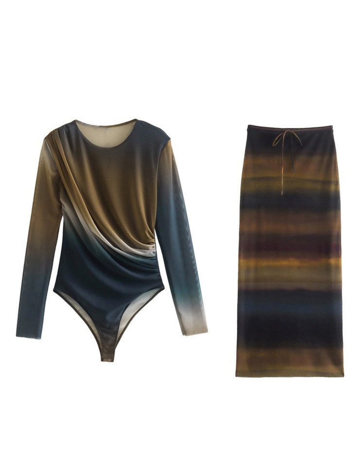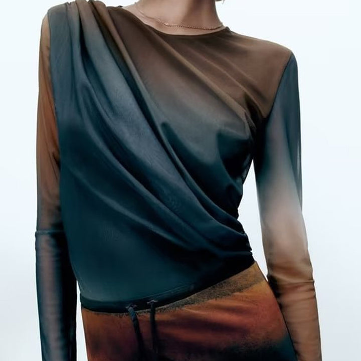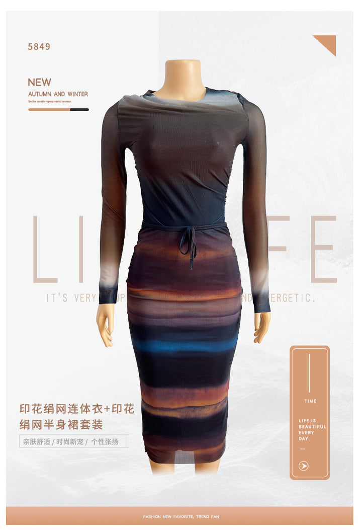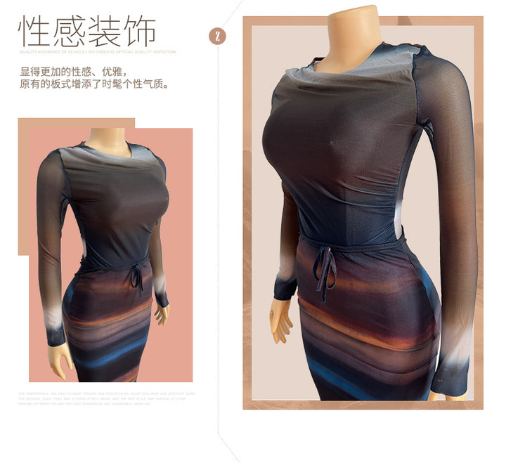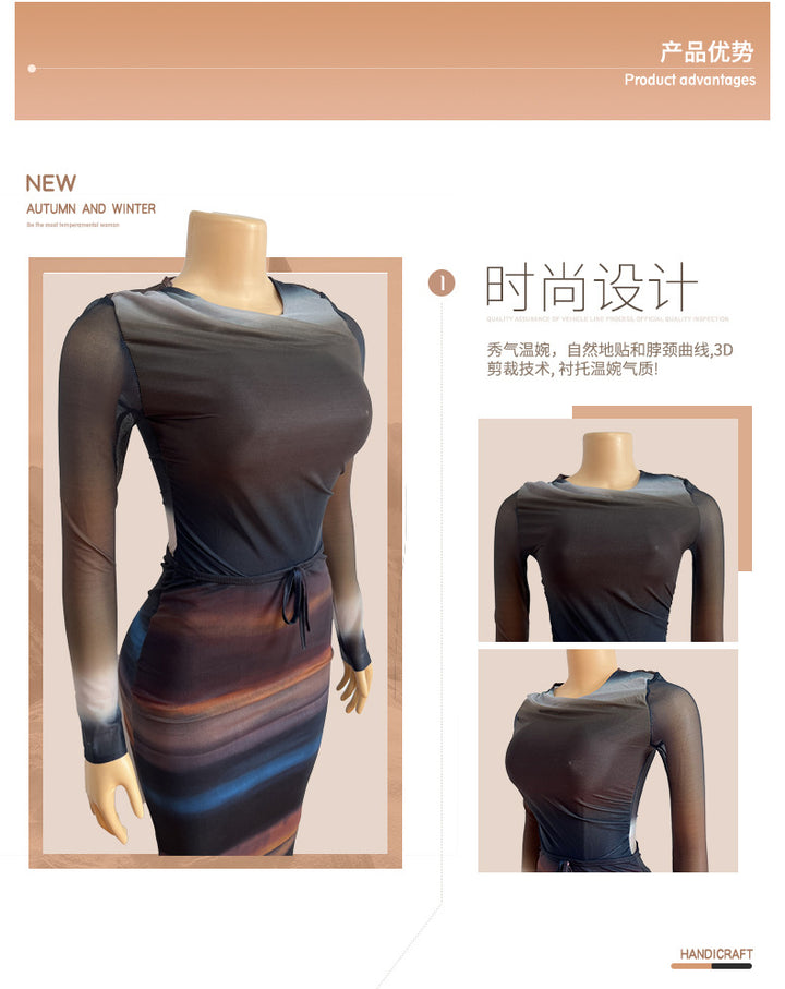 Foreign trade European and American style women's clothing long-sleeved mesh yarn round neck...