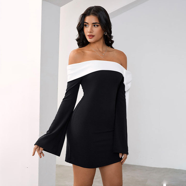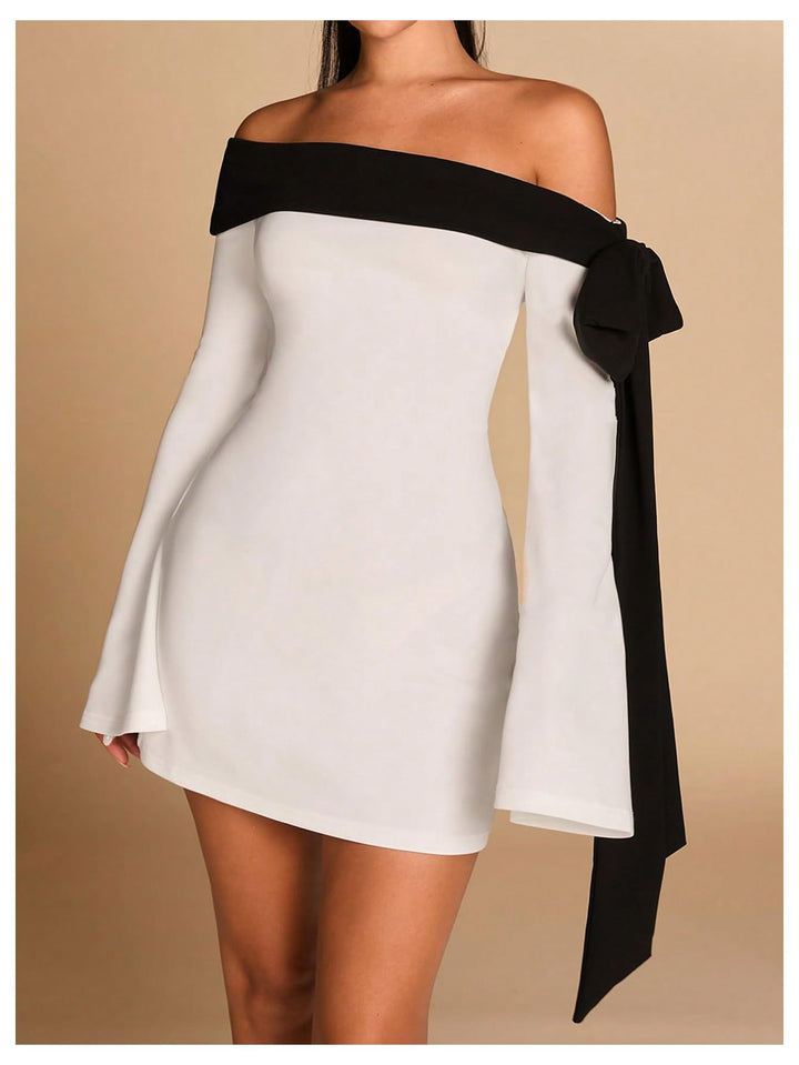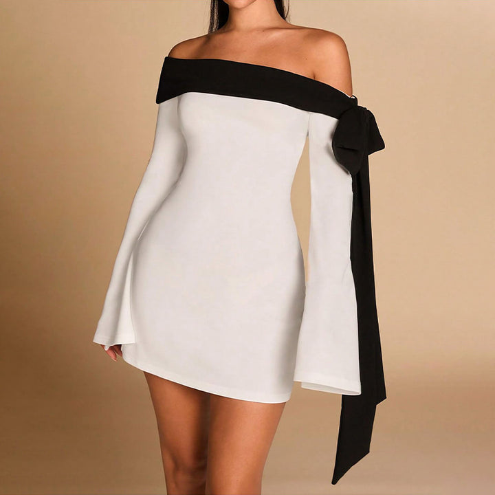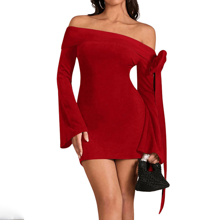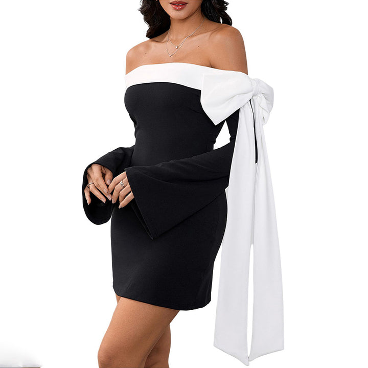 Foreign trade European beautiful women's off-the-shoulder horn sleeve mini dress bow cocktail party sexy tight dress