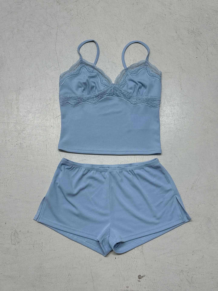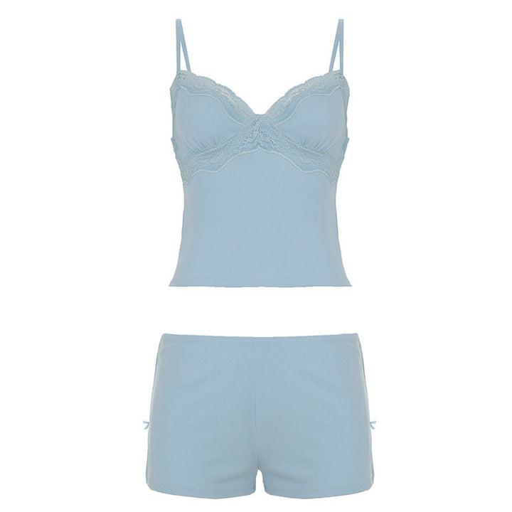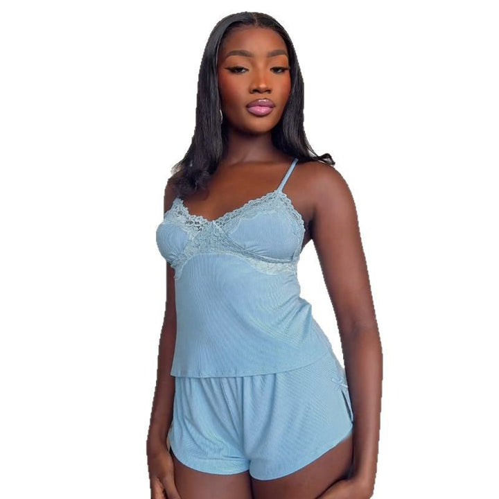 Foreign trade sexy women's casual loungewear set V-neck lace suspender top split elastic shorts two-piece set