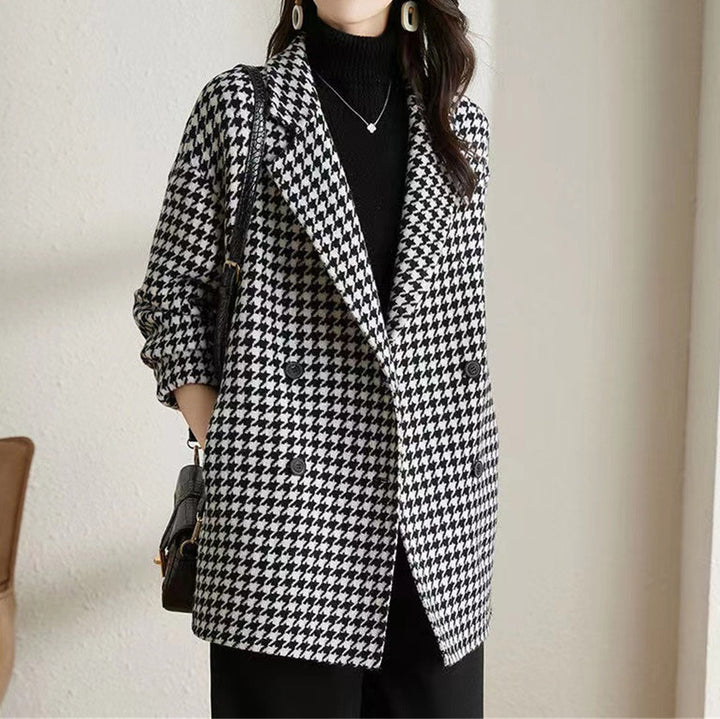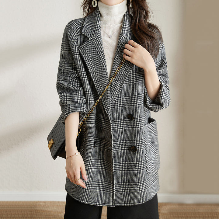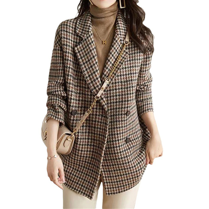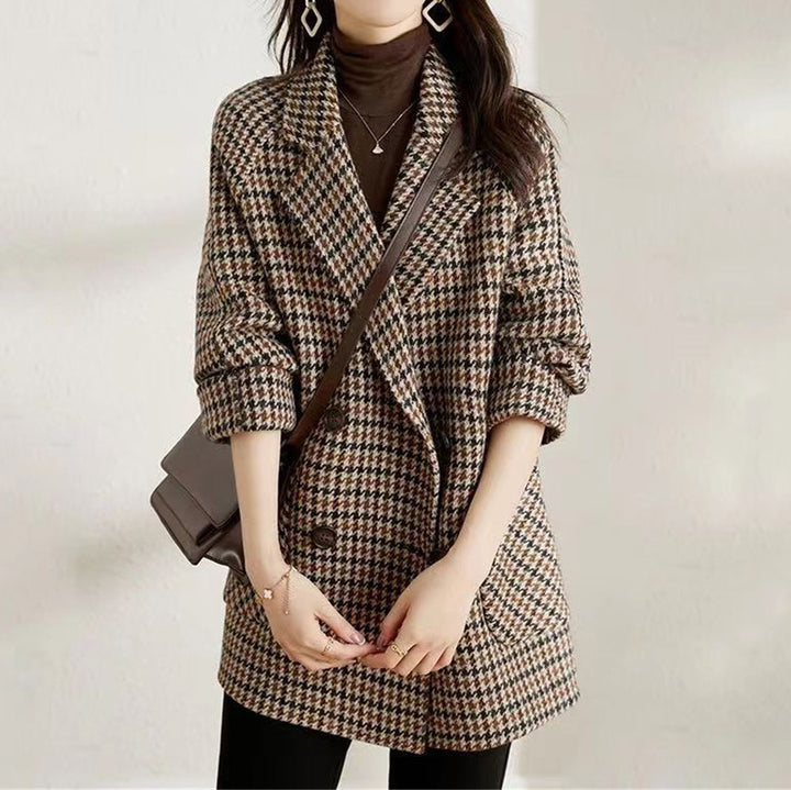 Foreign trade women's clothing 2025 autumn and winter new retro plaid blazer double-breasted thousand bird plaid woolen coat women