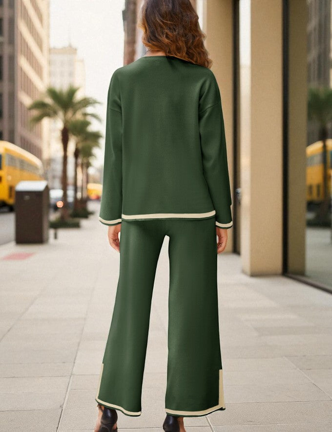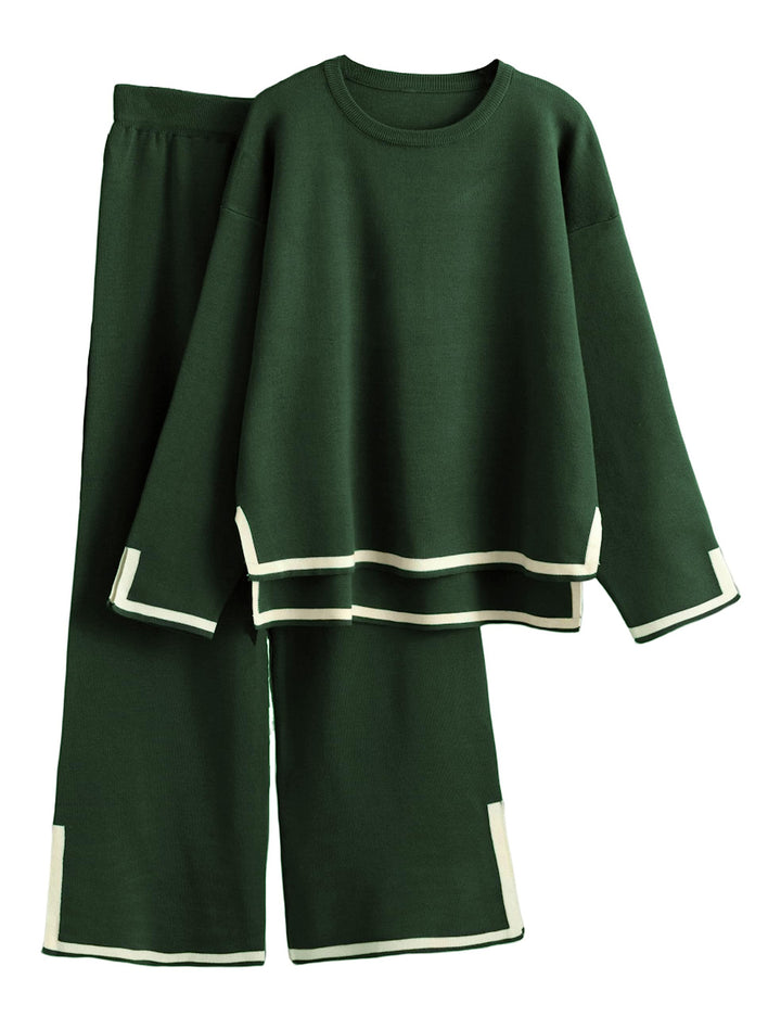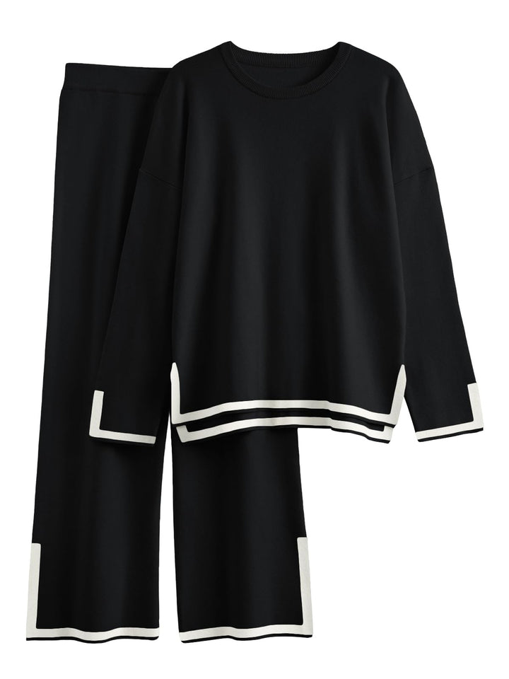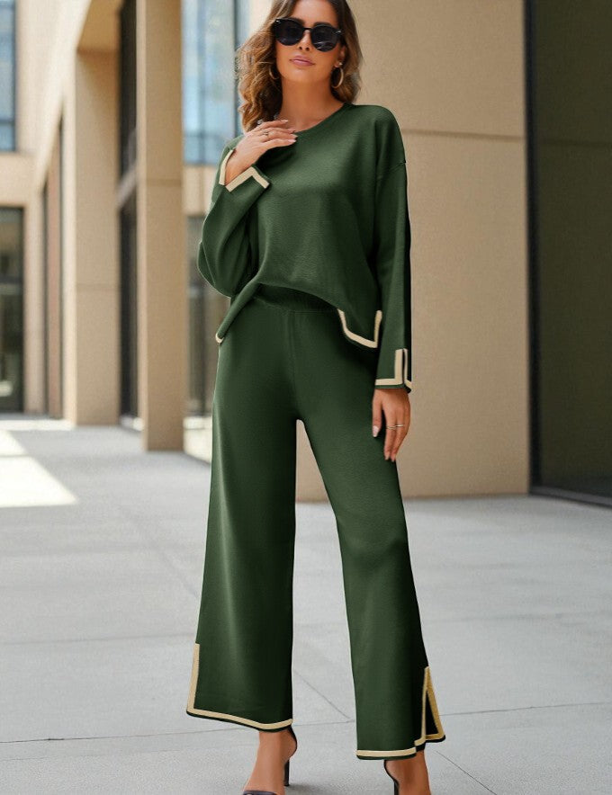 Foreign trade women's clothing 2025 autumn new temperament contrasting color split-ended long-sleeved knitted sweater high-waisted wide-leg pants set