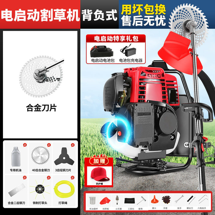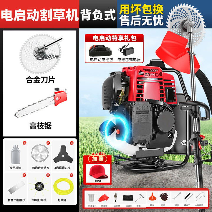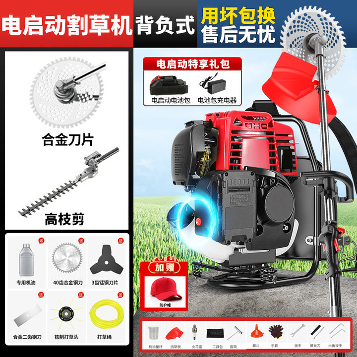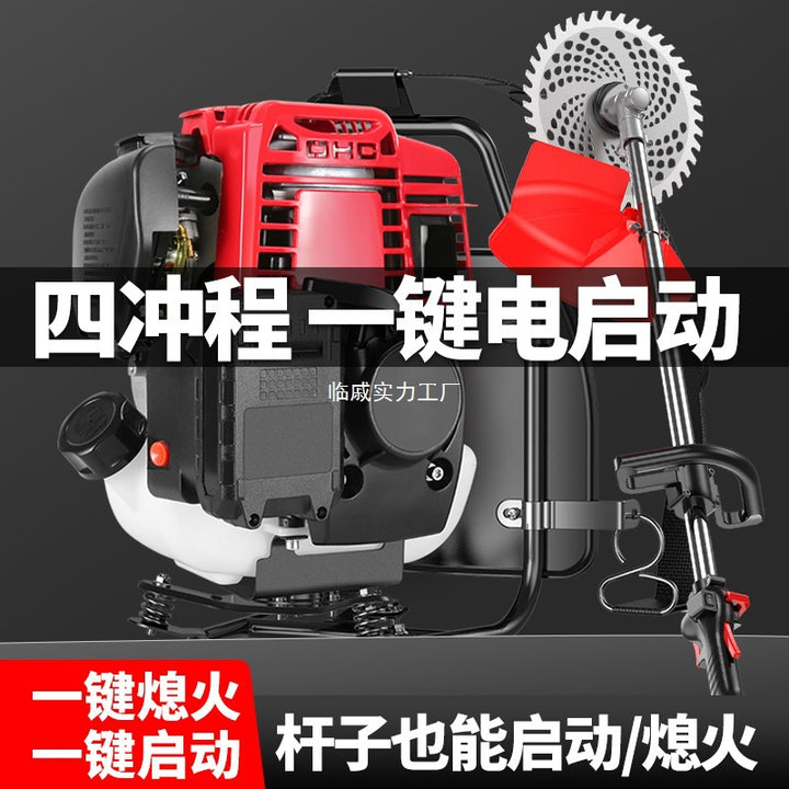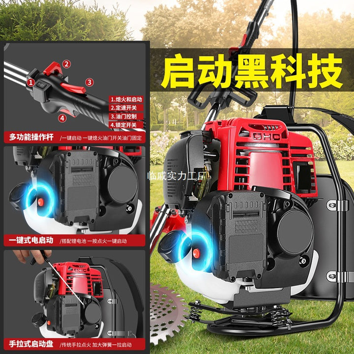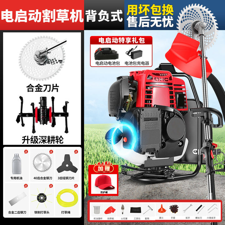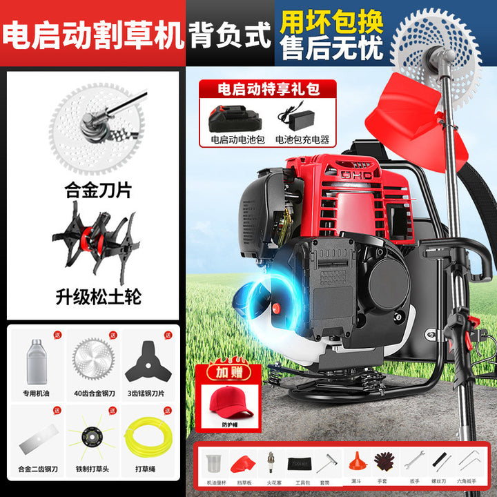 Four-rush gasoline lawn mower, backpack type, small multi-functional, lawn mowing, soil loosening and ditching, agricultural micro-tiller, wastelan...