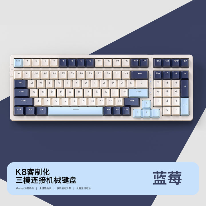 Free Wolf K8 three-mode mechanical keyboard low-light version hot-swappable green shaft, Free Wolf K8 three-mode mechanical keyboard low-light version hot-swappable red axis, Free Wolf K8 three-mode mechanical keyboard blueberry version hot-swappable green shaft, Free Wolf K8 three-mode mechanical keyboard blueberry version hot-swappable red axis |