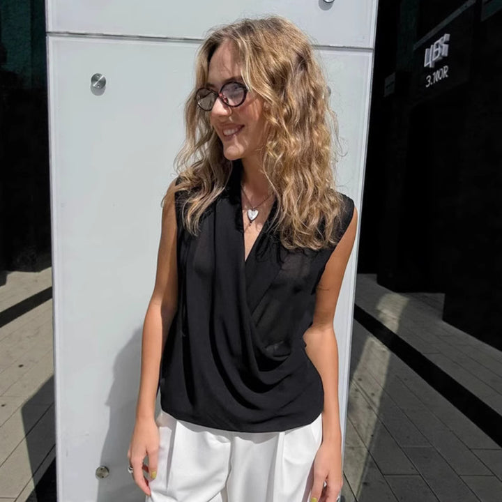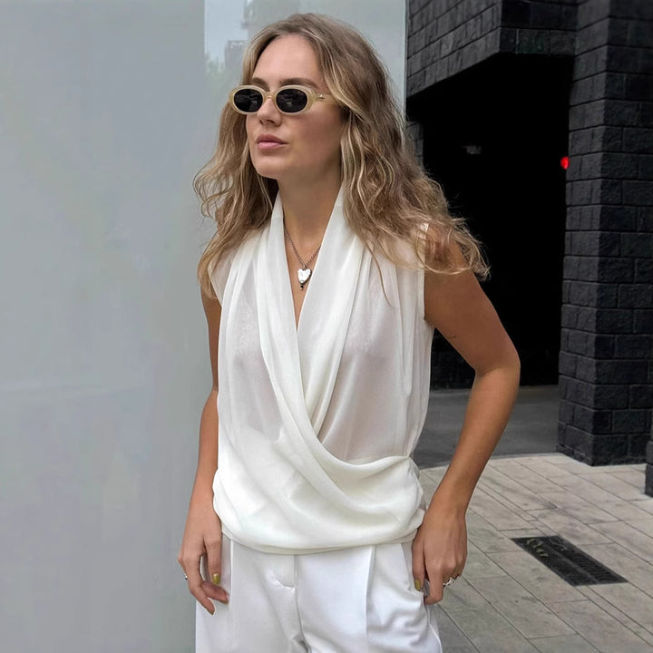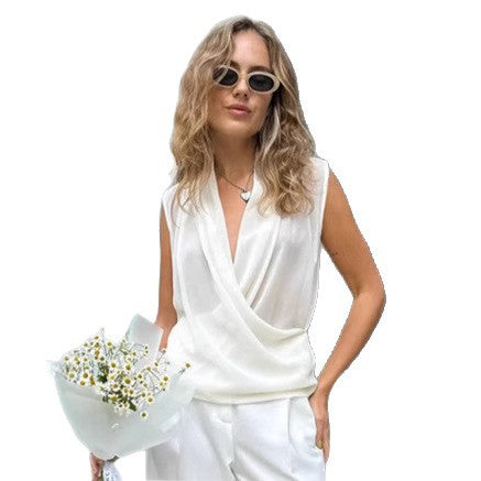 French drape chiffon top women's 2025 autumn wear design sense pullover loose white V-neck vest women's clothing