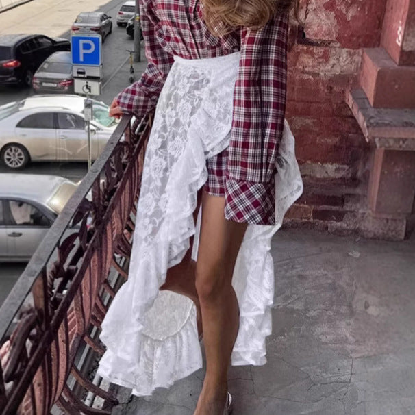 French Elegant White Lace Dress Children's 2025 Summer Design Asymmetrical Wrap Skirt Women's Clothing