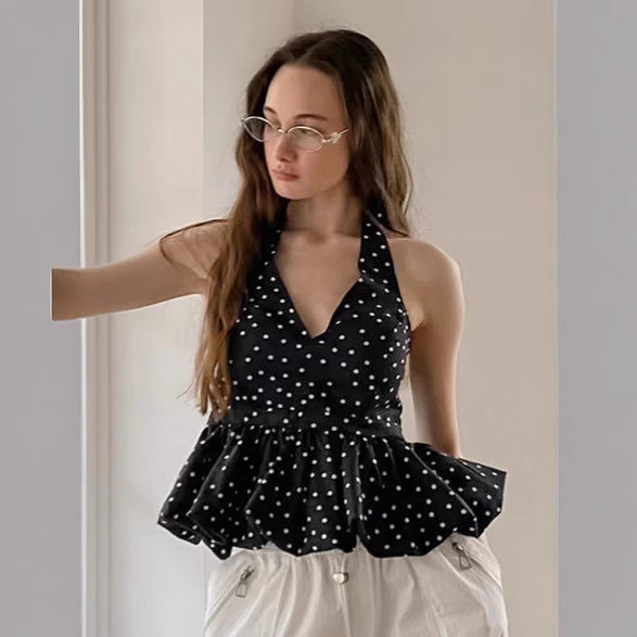 French retro polka dot neck vest women's 2025 summer spice girl lace-up sleeveless top desig...