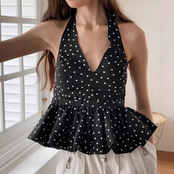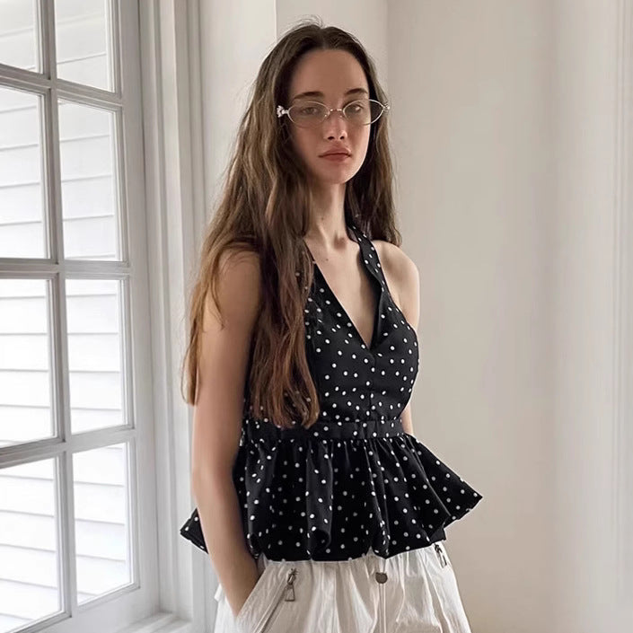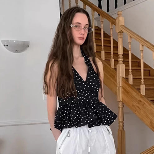 French retro polka dot neck vest women's 2025 summer spice girl lace-up sleeveless top desig...