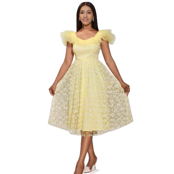 French romantic plum blossom mesh square neck dress, European and American elegant A pendulum waist party evening dress dress