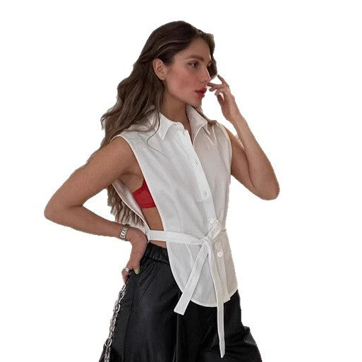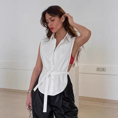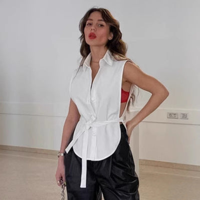 French temperament white lace-up lapel shirt women's 2025 autumn design sense pure cotton sl...