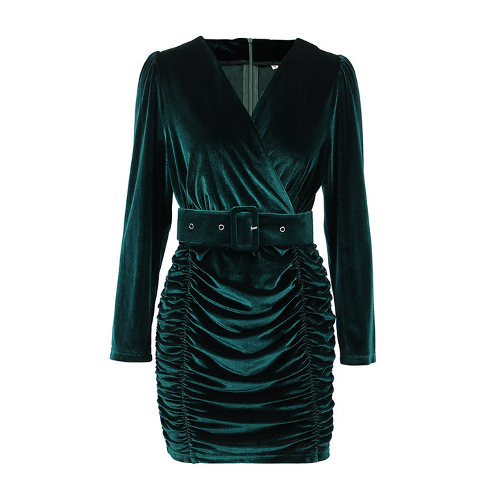 French velvet dress women's 2024 autumn and winter inner temperament malachite green drape tight hip skirt short women's clothing