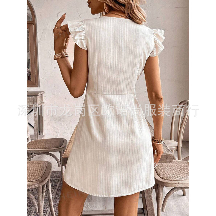 French women's retro style solid color textured fabric fly-sleeved dress, single button opening and closing, summer