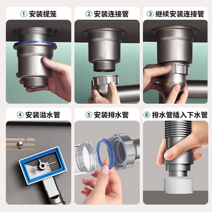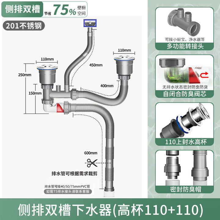 Full set of kitchen sink sewer, side row insect-proof and odor-proof, high and low sink universal drain pipe sewer