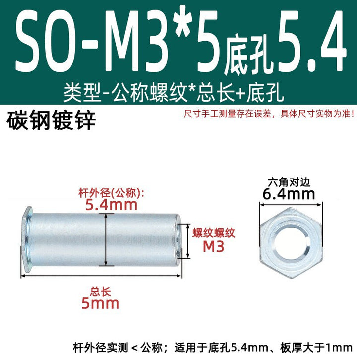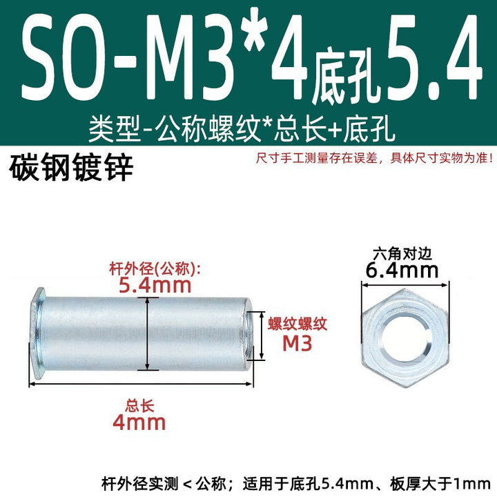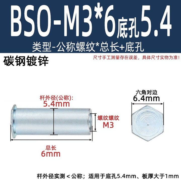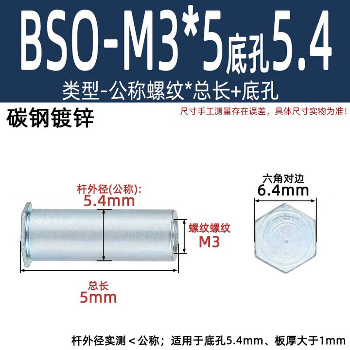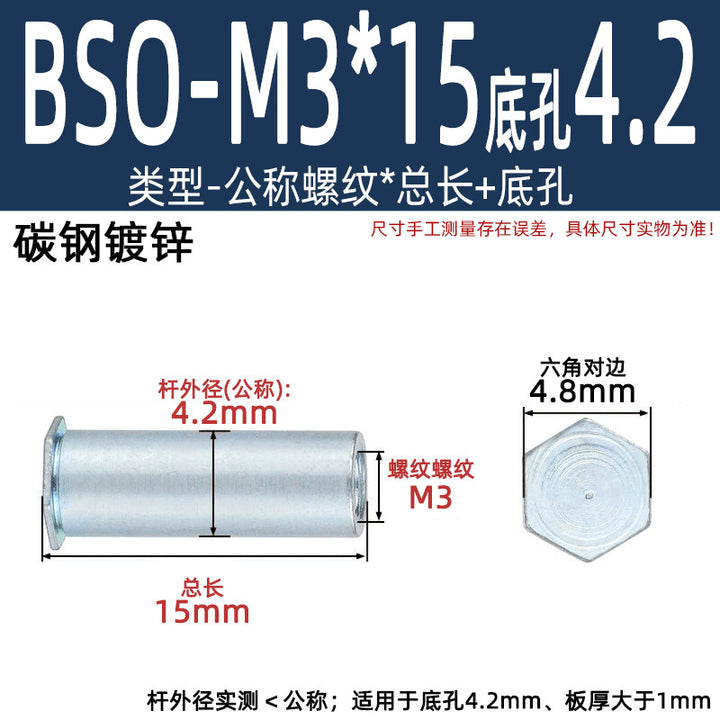 Blind hole BSO-M3 * 5 plate hole 4.2 white zinc, Blind hole BSO-M3 * 10 plate hole 4.2 white zinc, 盲孔BSO-M3*12板孔4.2白锌, 盲孔BSO-M3*14板孔4.2白锌, 盲孔BSO-M3*15板孔4.2白锌, 盲孔BSO-3.5M3*4板孔5.4白锌, 盲孔BSO-3.5M3*5板孔5.4白锌, 盲孔BSO-3.5M3*6板孔5.4白锌, 盲孔BSO-3.5M3*7板孔5.4白锌, Blind hole BSO-3.5M3 * 8 plate hole 5.4 white zinc, Blind hole BSO-M4 * 6 plate hole 6 white zinc, Through Hole SO-3.5M3 * 4 Plate Hole 5.4 White Zinc, Through hole S0-3.5M3 * 5 plate hole 5.4 white zinc, Through Hole SO-M4 * 6 Plate Hole 6 White Zinc, Through Hole S0-M6 * 12 Plate Hole 8.8 White Zinc |