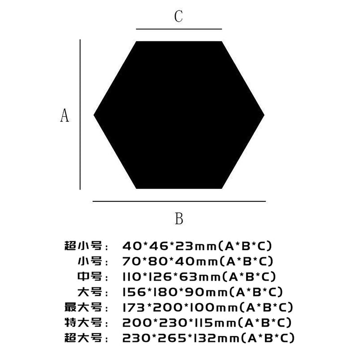Hexagonal super small 46 * 40 * 23mm piece, 六边形小号80*70*40mm一片, Hexagonal small 80 * 70 * 40mm piece, Hexagonal medium 126 * 110 * 63mm piece, Hexagonal large 180 * 156 * 90mm piece, Hexagon maximum size 200 * 173 * 100cm piece, Hexagonal extra large 230 * 200 * 115mm piece, Hexagonal oversized 265 * 230 * 132 piece |