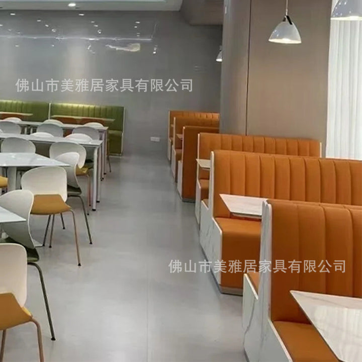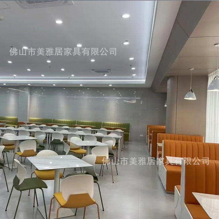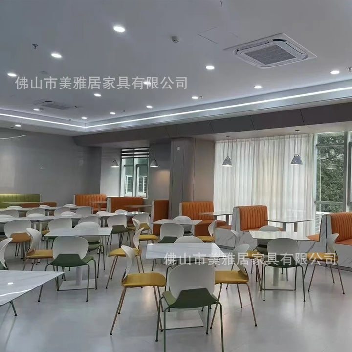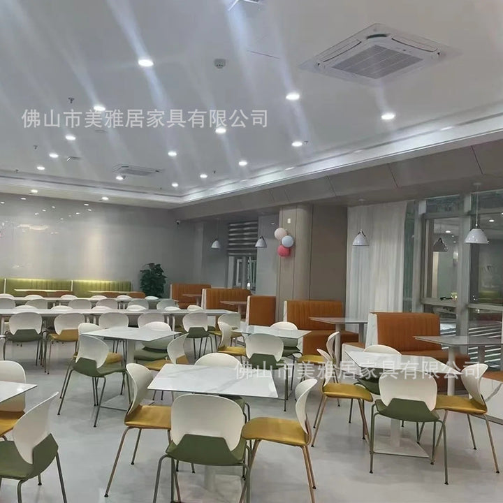 Cafeteria dining chair A, Canteen dining chair B yellow and white, Canteen dining chair B green and white, Canteen rock slab dining table 120 * 60 long table, Canteen rock slab dining table 60 * 60 square table, Canteen rock slab dining table diameter 60 round table, booth |