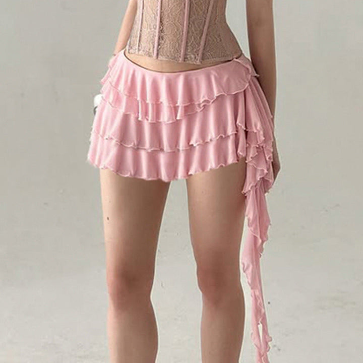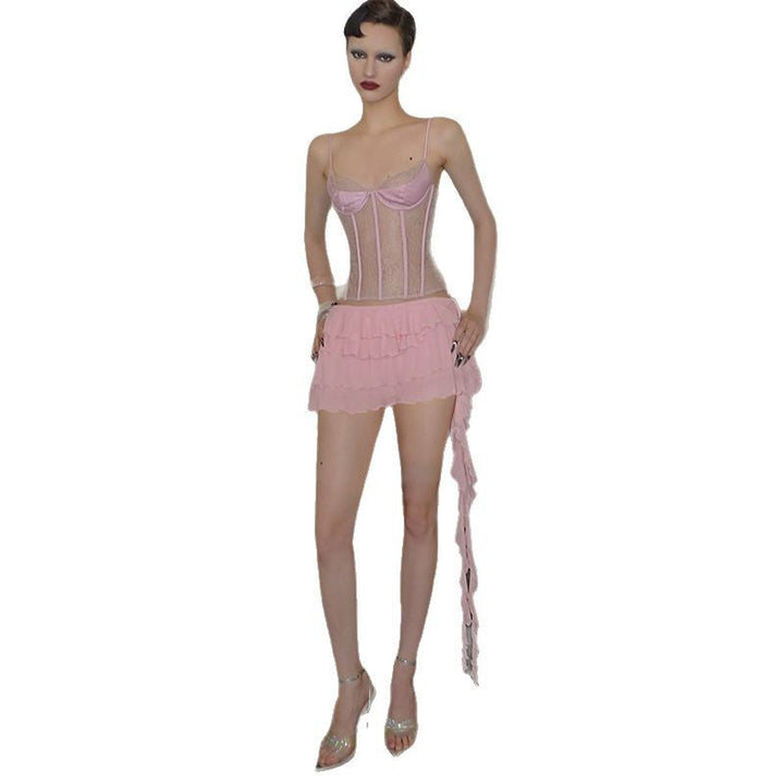 Holiday style irregular streamer mesh skirt splicing lace perspective sexy pure desire suspender set two-piece set