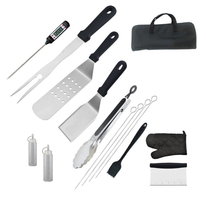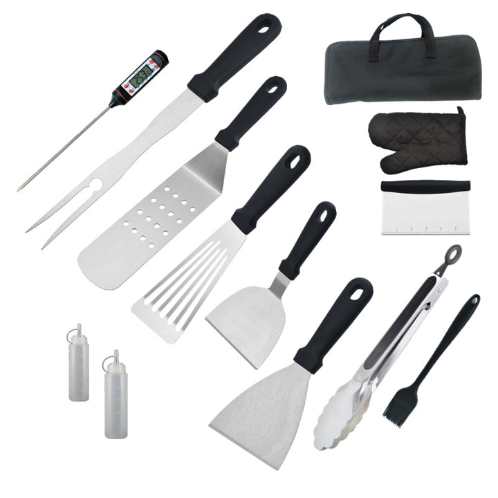 12-Piece set + storage bag, 14-Piece set + storage bag, Long dense shovel, Long leak shovel, 三边开口铲, 大宽铲, 斜口铲, 小号切面刀, 大号切面刀, 扇形鱼铲, 烤叉, 9寸钢头夹, 布手套(黑色), 布手套(红色), 温度计, 酱料瓶240ml, 圆烤签(1支), Black silicone small oil brush |