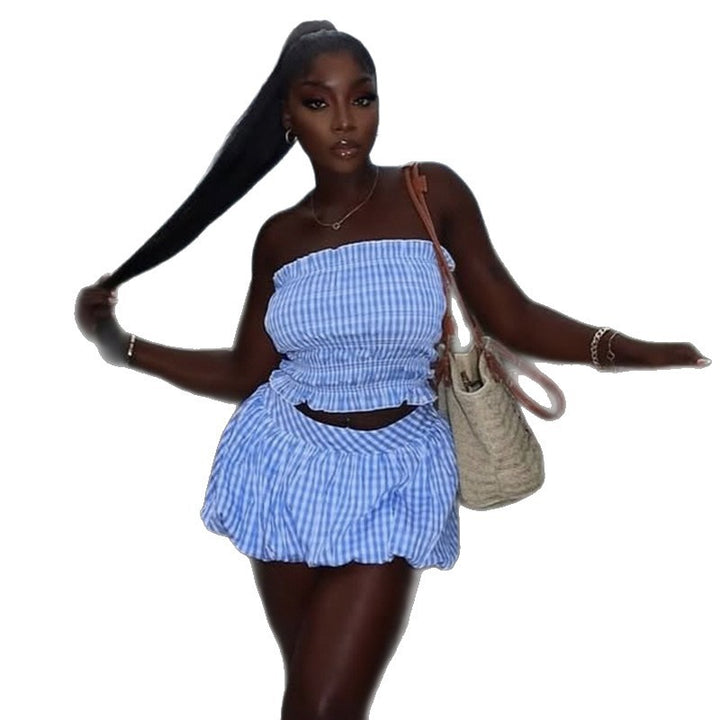 In stock, European and American women's clothing 2025 autumn new fresh waist striped tube top puff skirt set