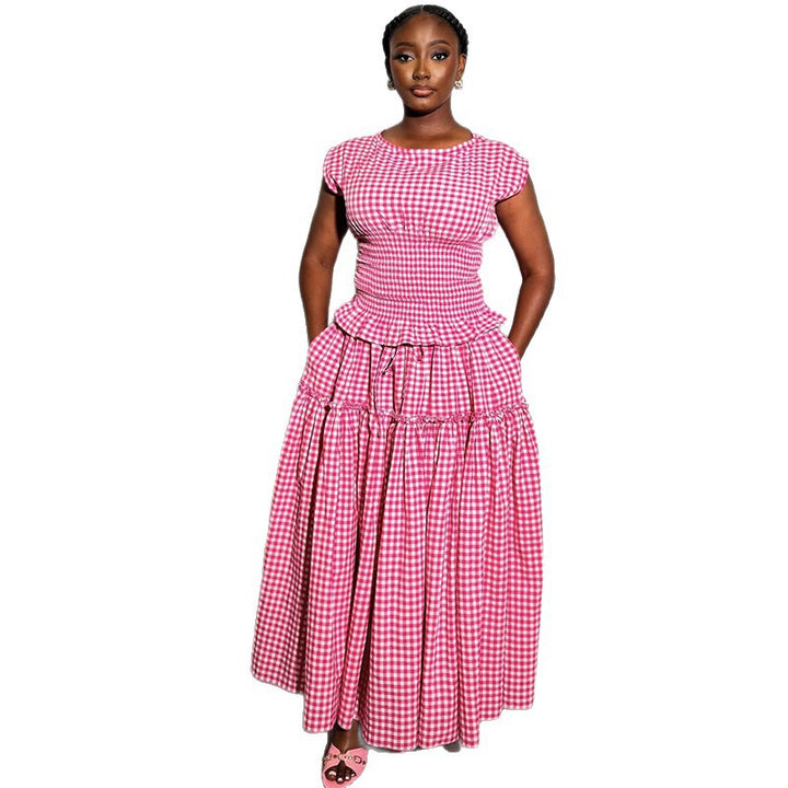 In stock, European and American women's clothing 2025 summer new fashion plaid waist slim top skirt set