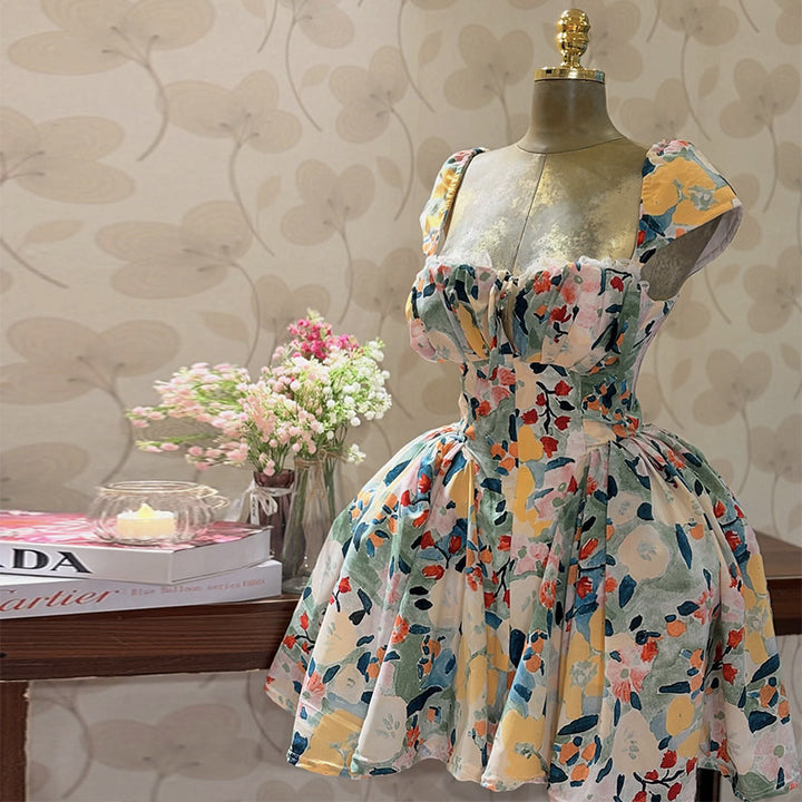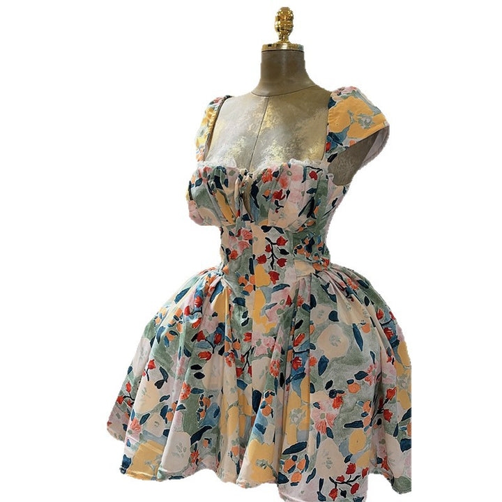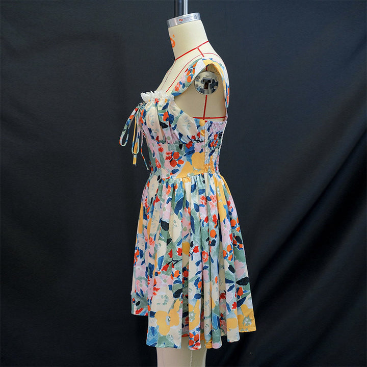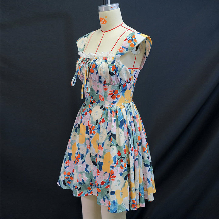 In stock, European and American women's clothing 2025 summer new fresh suspender lace printed pleated skirt dress