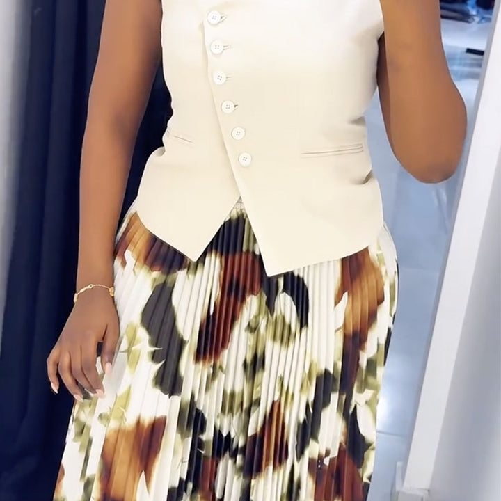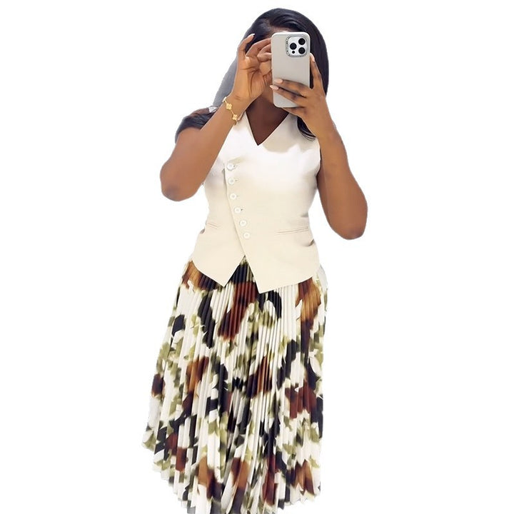 In stock, European and American women's clothing 2025 summer new V-neck button-down vest top printed pleated long skirt set