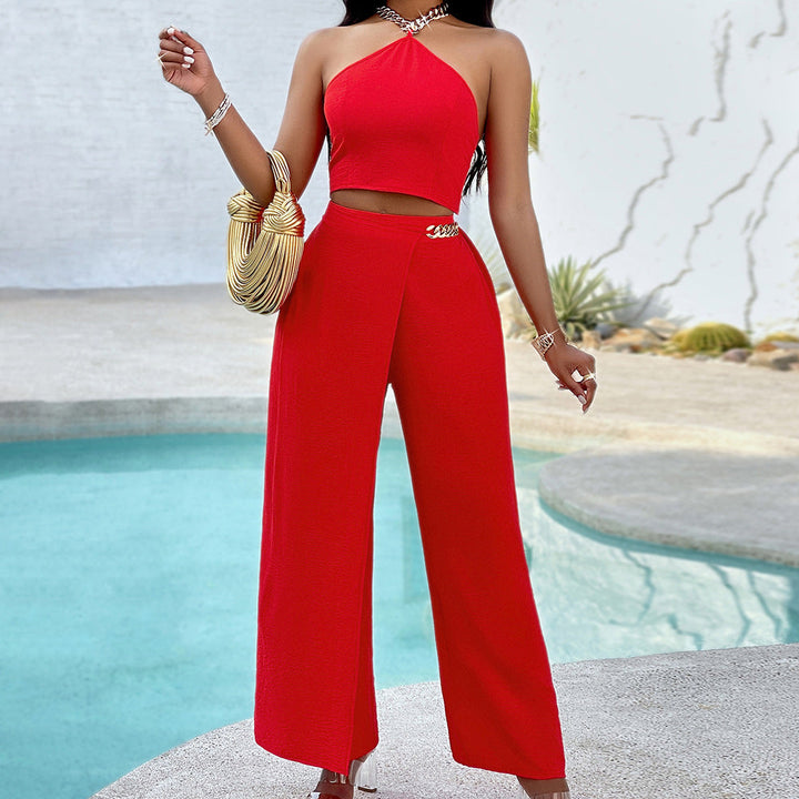 Independent Station AliExpress Summer European and American New Women's Clothing 2025 Trendy Sexy Solid Color Neck Top Pants Set