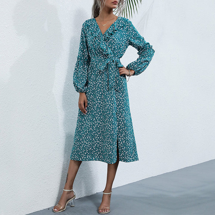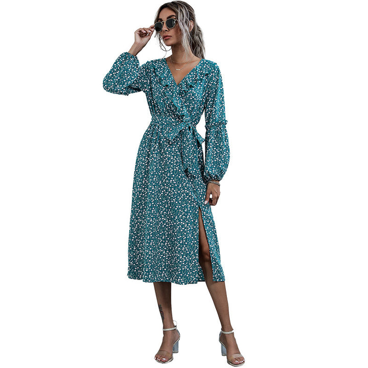 Independent Station Cross-border Autumn and Winter European and American Fashion Foreign Trade Women's Clothing Lotus Leaf Collar Long Sleeve Flora...