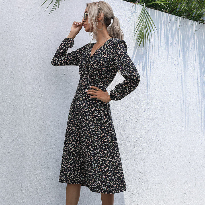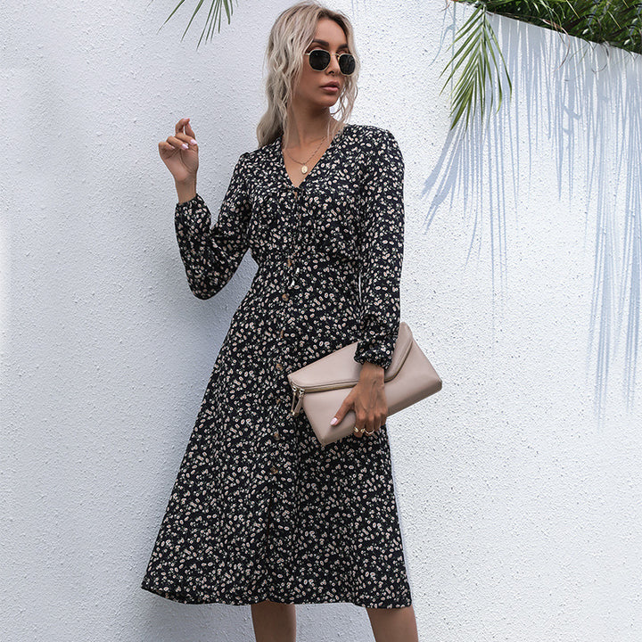 Independent Station Cross-border European, American and fashion women's clothing black lace-up split-ended long-sleeved floral dress