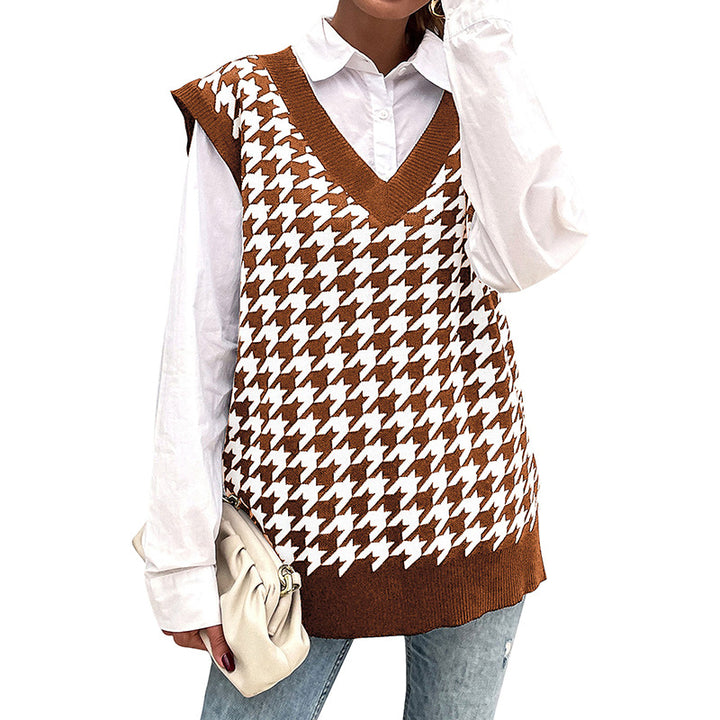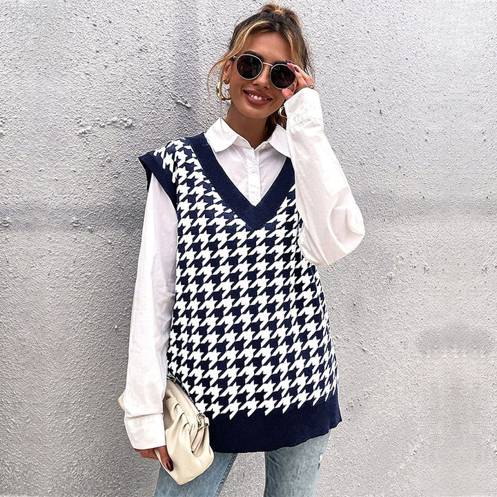Independent Station Cross-border Foreign Trade Women's Clothing Early Autumn New European and American Loose Thousand Birds Grid V-Neck Knitted Ves...