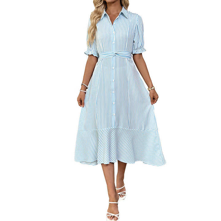 Independent station new dating commuter style shirt type bubble sleeve lapel striped dress women's summer dress