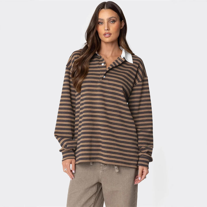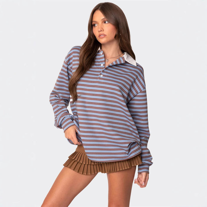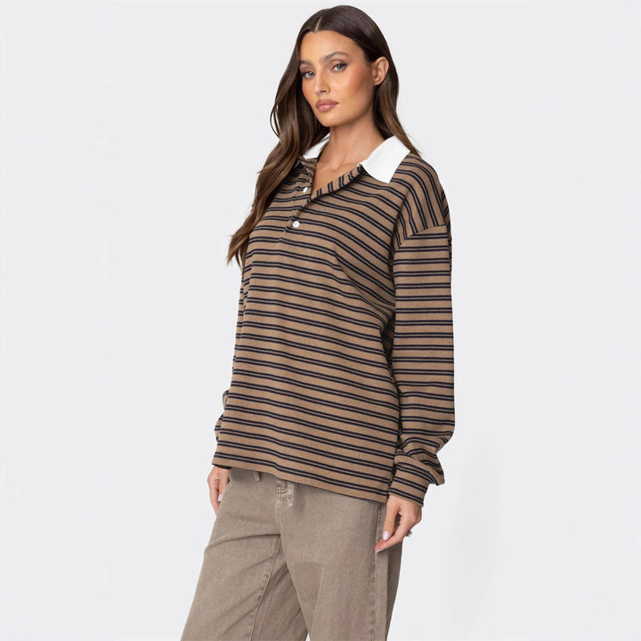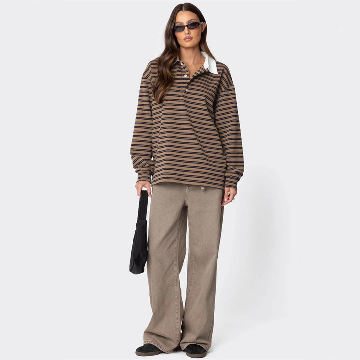 Independent Station New Long Sleeve T-Shirt Women's American Loose Retro Lapel Striped Casual...