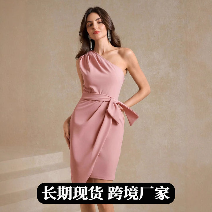 Independent station popular women's clothing, European and American new satin dresses, summer sexy pink satin banquet evening dresses