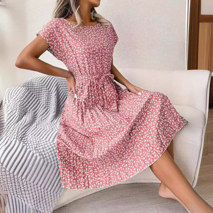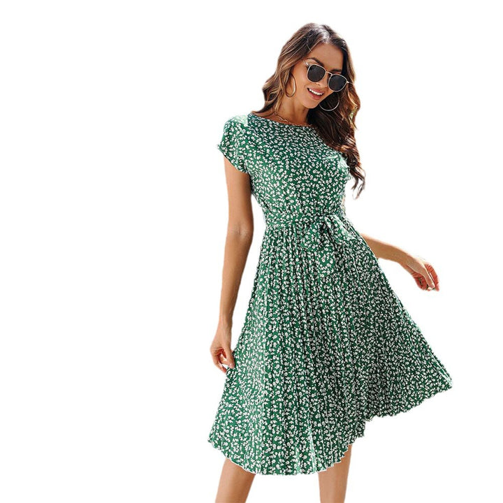 Independent station women's clothing 2024 spring and summer new casual short-sleeved floral lace-up dress pleated skirt