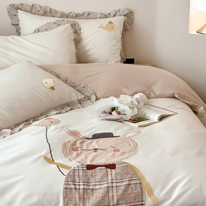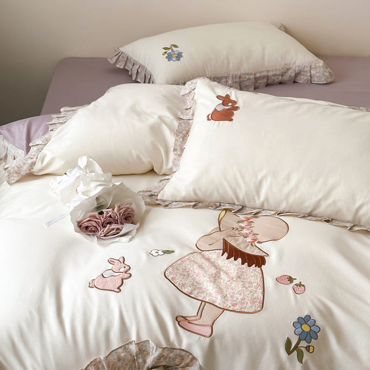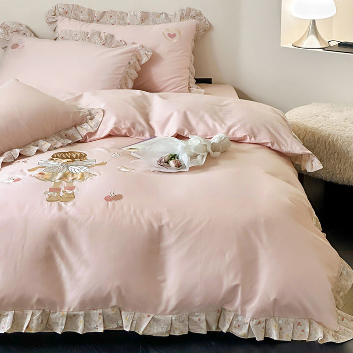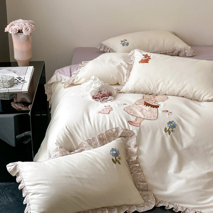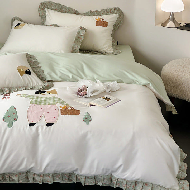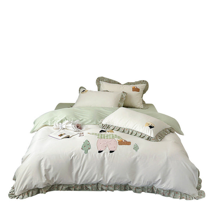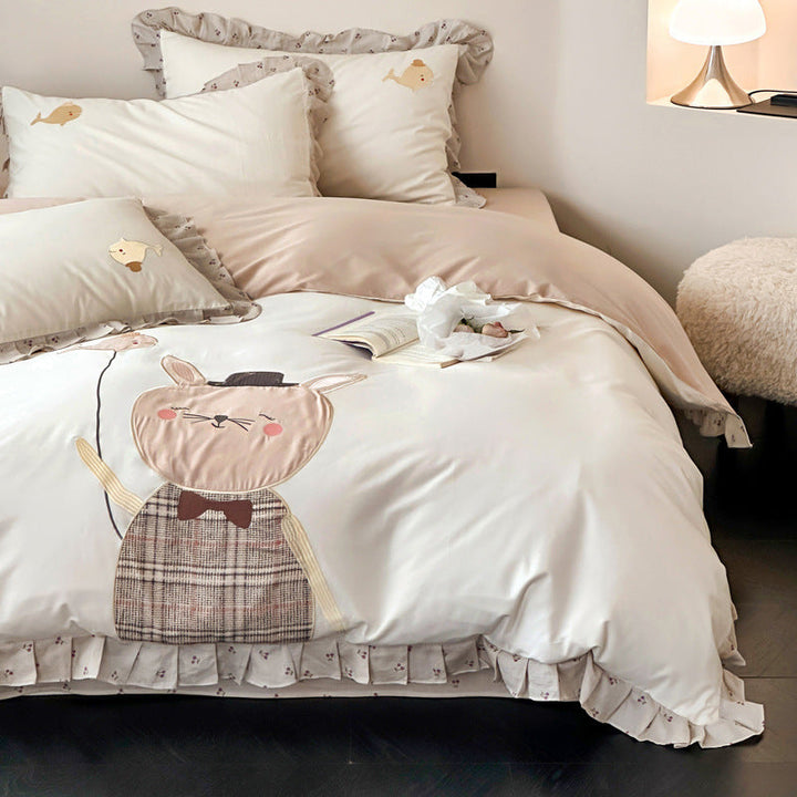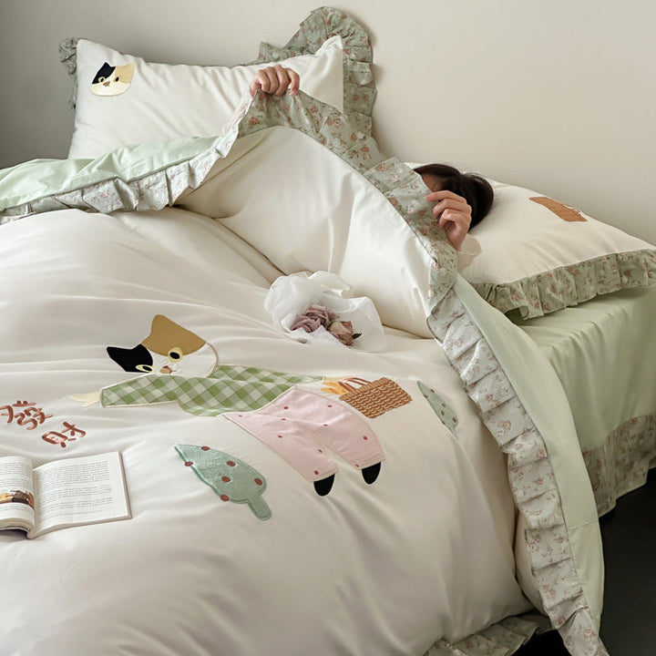 ins lace embroidery pure cotton wrinkled yarn four-piece set cartoon cat cotton double-layer yarn skin-friendly bed sheet quilt cover 1.8