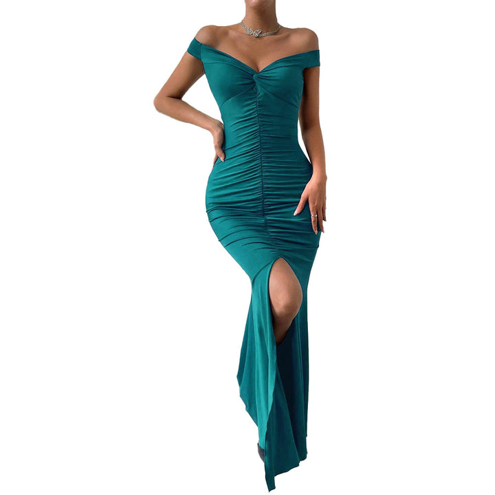 ins new product 2024 European and American sexy and elegant one-word shoulder slim and thin hem split hip wrap dress