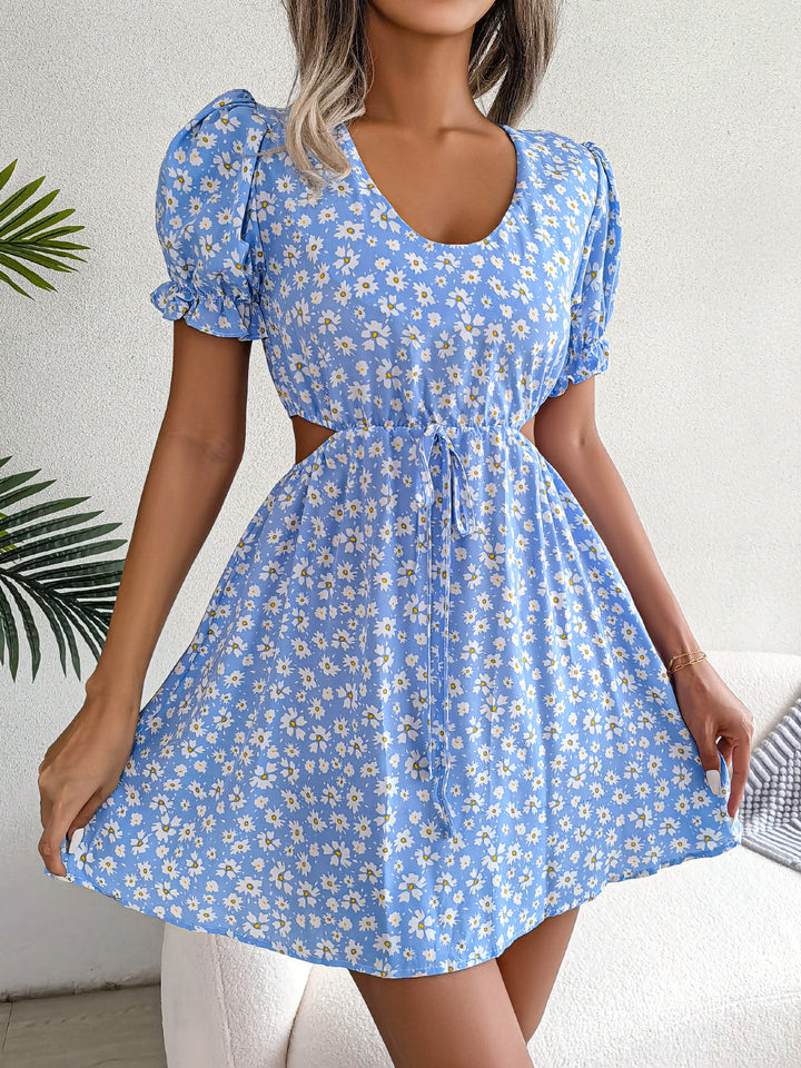 ins wind real shot 2022 spring and summer casual hollow lace-up short-sleeved floral dress, independent station women's clothing