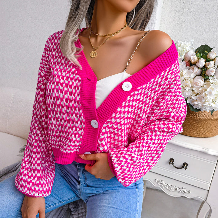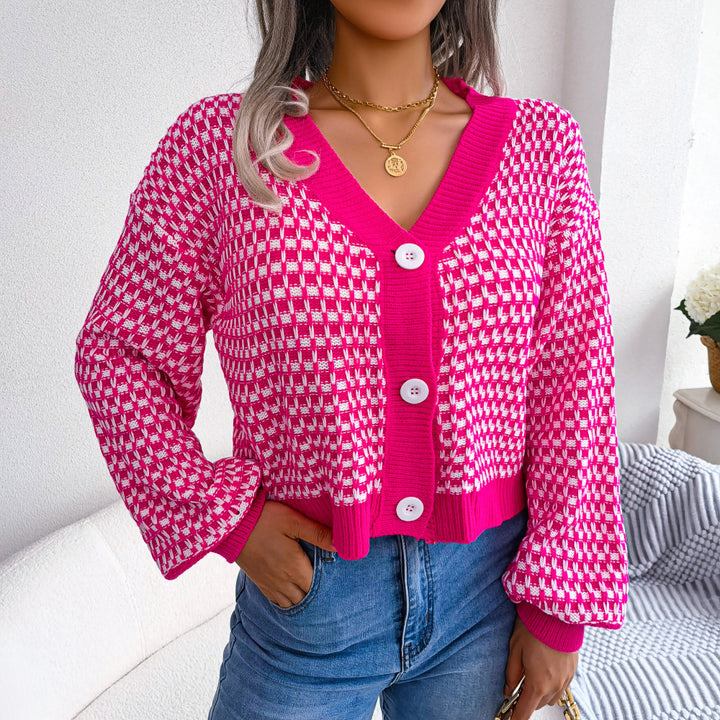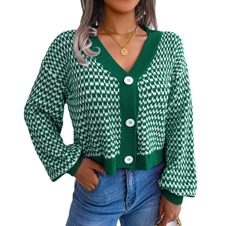 ins wind real shot autumn and winter European and American contrasting colors plaid lantern sleeves cardigan sweater jacket, women's clothing