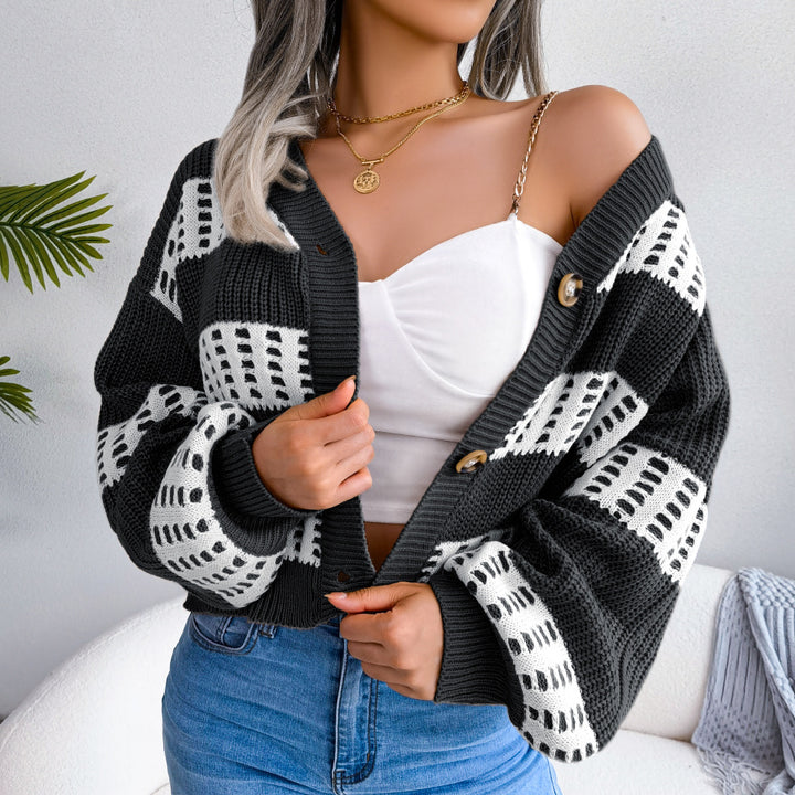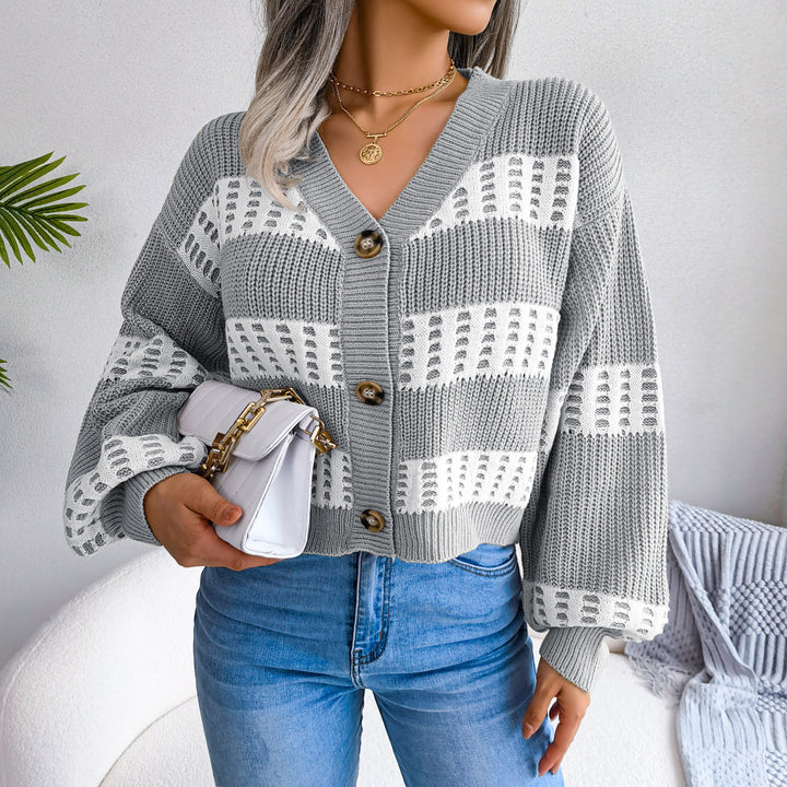ins wind real shot autumn and winter European and American design contrasting color lantern sleeves cardigan sweater jacket, independent station w...