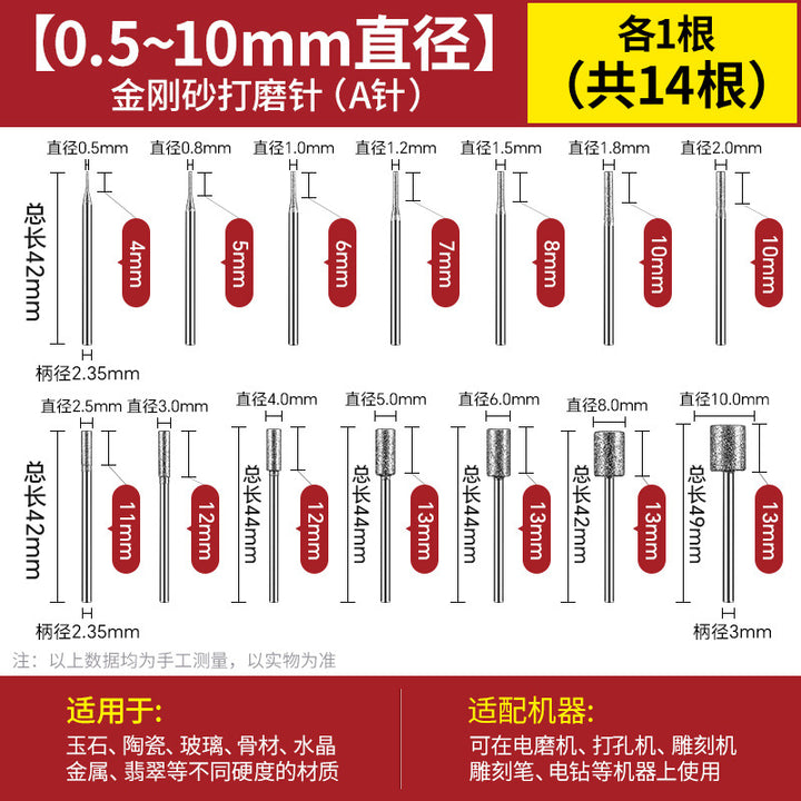 【14种0.5-10mm各1根】共14根, 【14种0.5-10mm各2根】共28根, 【5种0.5+0.8+1+1.2+1.5mm各2根】共10根, 【5种1.2+1.5+1.8+2+2.5mm各2根】共10根, 【5种2+2.5+3+4+5mm各2根】共10根, 【5种4+5+6+8+10mm各2根】共10根, [0.5Mm] 2.35 handle 10 pieces, [0.8Mm] 2.35 handle 10 pieces, [1.0Mm] 2.35 handle 10 pieces, [1.2mm] 2.35 handle 10 pieces, [1.5mm] 2.35 handle 10 pieces, [1.8mm] 2.35 handle 10 pieces, [2.0Mm] 2.35 handle 10 pieces, [2.5Mm] 2.35 handle 10 pieces, [3.0Mm] 2.35 handle 10 pieces, [4.0Mm] 2.35 handle 10 pieces, [5.0Mm] 2.35 handle 10 pieces, [6.0Mm] 2.35 handle 10 pieces, [8.0Mm] 2.35 handle 10 pieces, [10Mm] 3.0 handle 10 pieces, [5 pieces each of 0.5 + 0.8mm] A total of 10 pieces, [5 pieces each of 0.8 + 1.0mm] 10 pieces in total, 【1.0+1.2mm各5根】共10根, 【1.2+1.5mm各5根】共10根, 【1.5+1.8mm各5根】共10根, 【1.8+2.0mm各5根】共10根, 【2.0+2.5mm各5根】共10根, 【2.5+3.0mm各5根】共10根, 【3.0+4.0mm各5根】共10根, 【4.0+5.0mm各5根】共10根, [5 pieces each of 5.0 + 6.0mm] A total of 10 pieces, [5 pieces each of 6.0 + 8.0mm] 10 pieces in total, [5 pieces each of 8.0 + 10mm] 10 pieces in total |