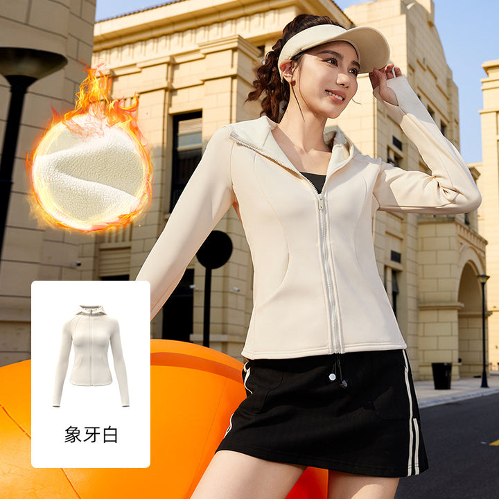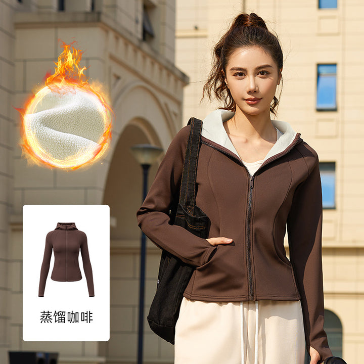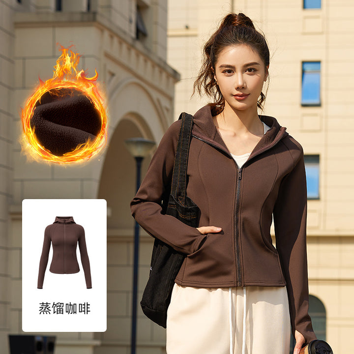 Juyitang's new autumn and winter outdoor yoga clothes, fleece thickened slim-fit zipper cardigan, windproof hooded sports jacket
