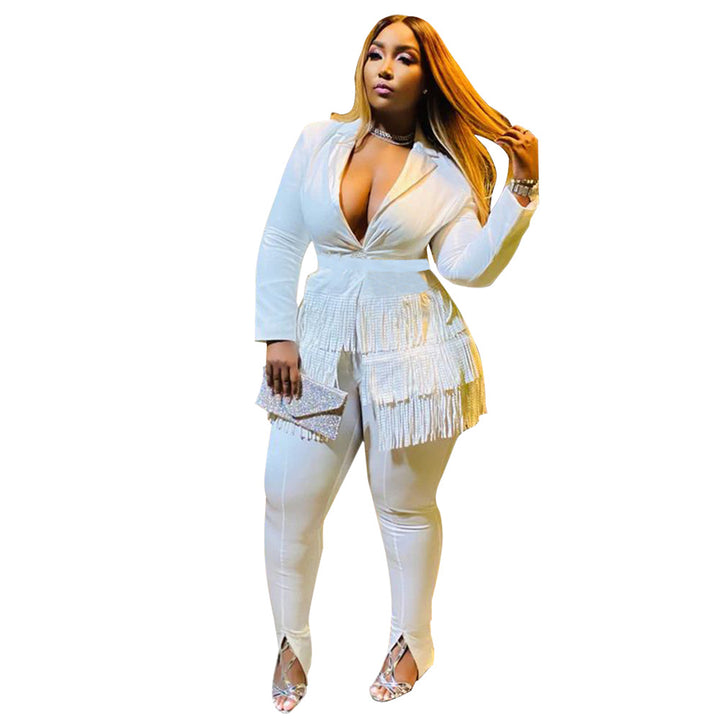 K10228 European and American fashion women's clothing popular V-neck fringed small suit long-sleeved Roman pants set in stock