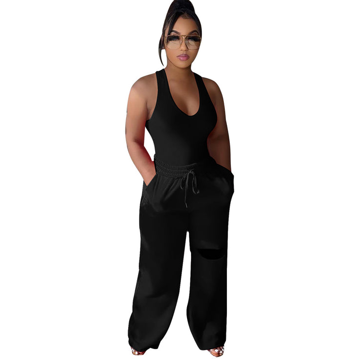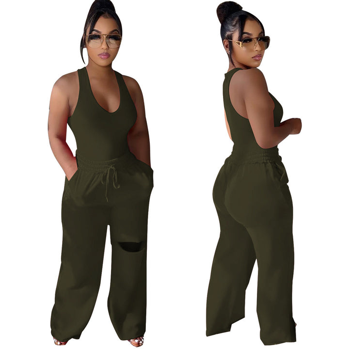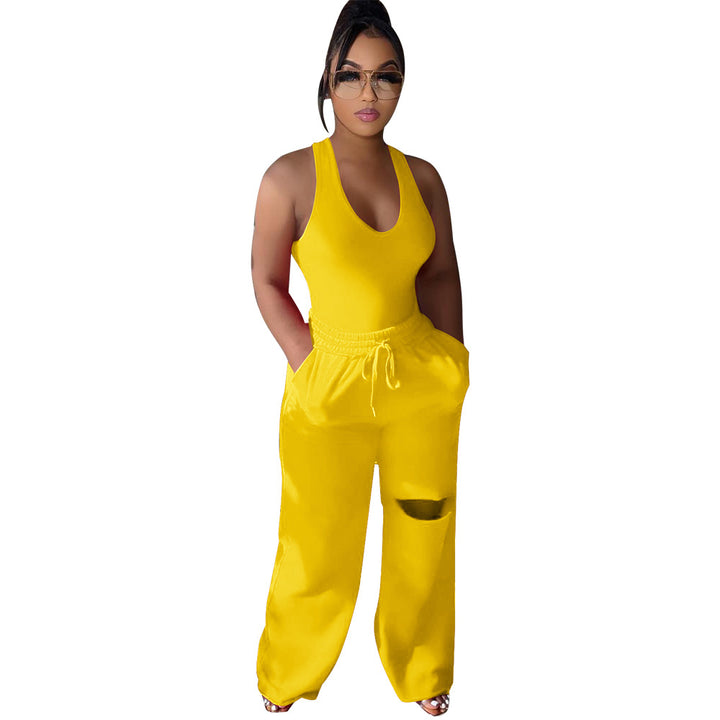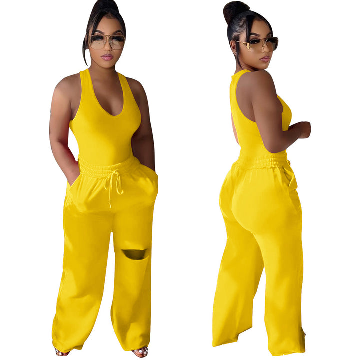 K10294 Independent Station, European and American women's clothing 2023 solid color U-neck onesie ripped wide-leg pants set new