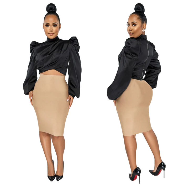 K10304 European and American fashion women's clothing autumn new bubble sleeve turtleneck short imitation silk top