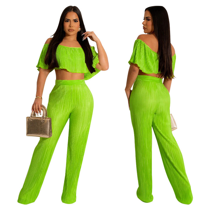 K10470 Independent Station European and American Cross-border Women's Clothing 2023 Explosive Folded Lotus Leaf Edge Shoulder Wide Leg Pants Set New