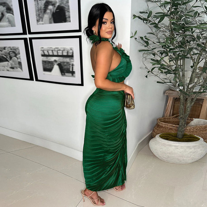 K10734 factory wholesale European and American fashion women's clothing sleeveless split ruffle edge pleated skirt set