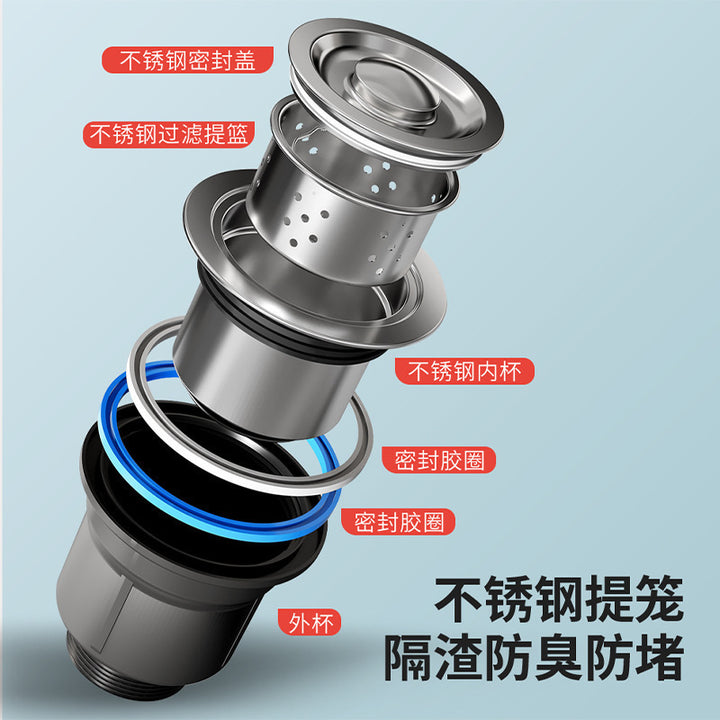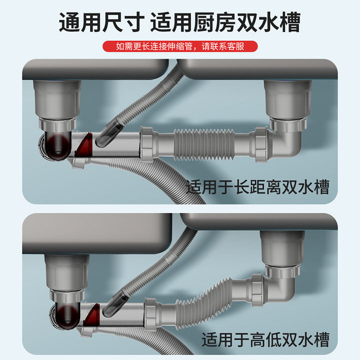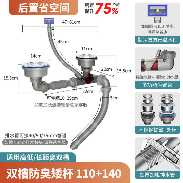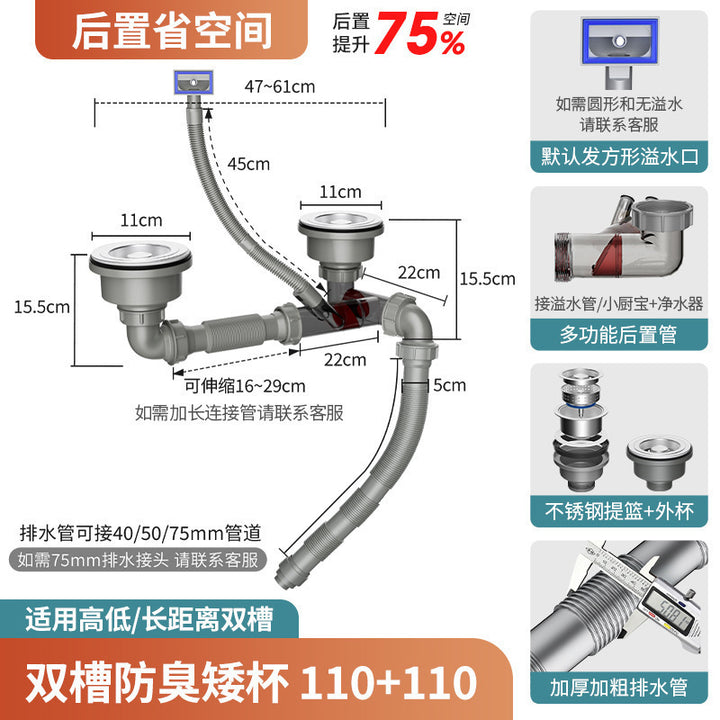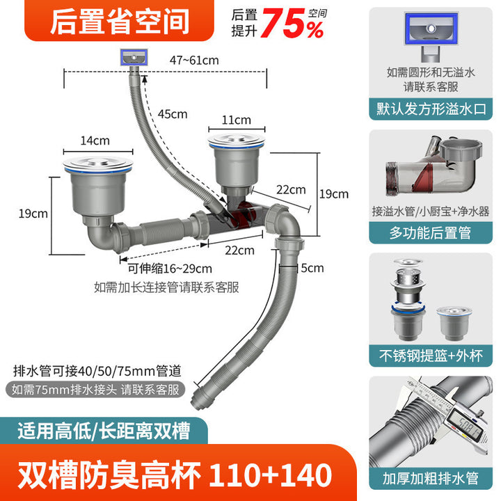 Kitchen sewer pipe, stainless steel vegetable washing basin, drain pipe accessories, retractable, anti-return odor, double-slot sewer, full set