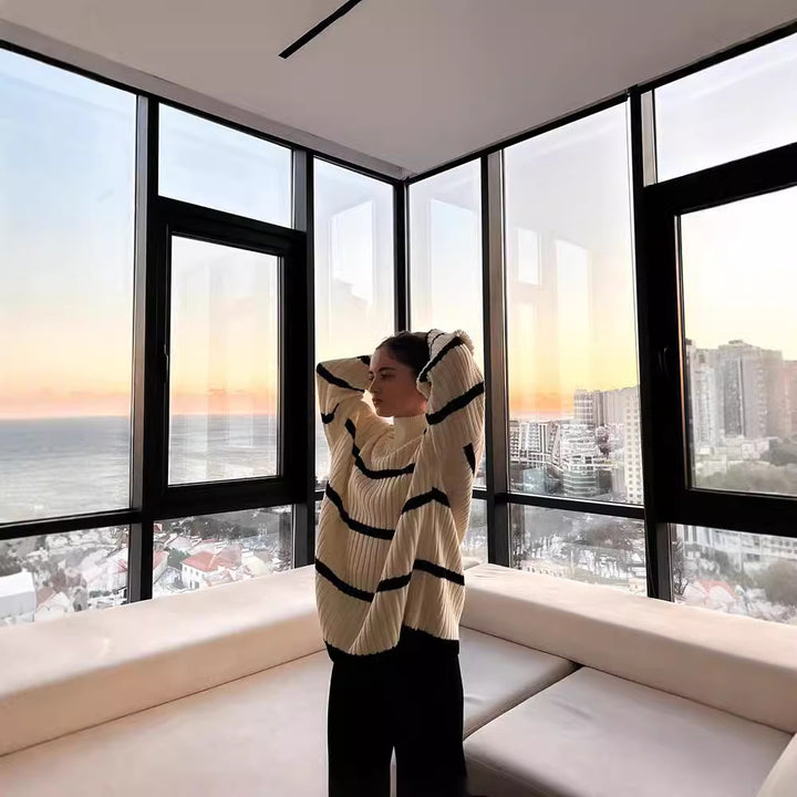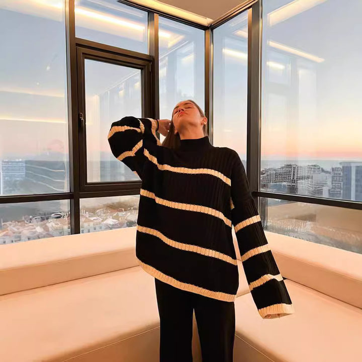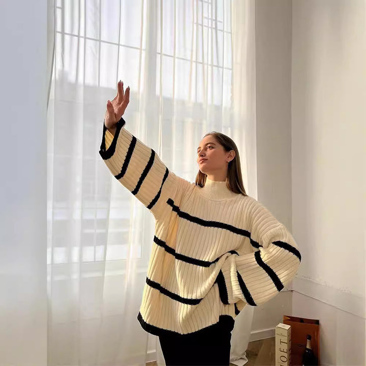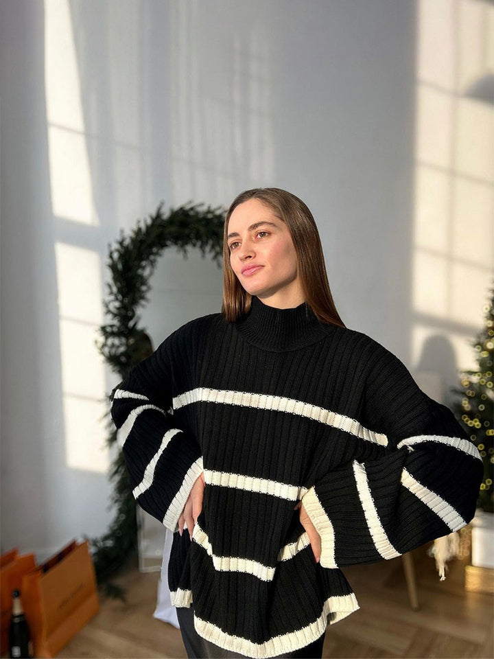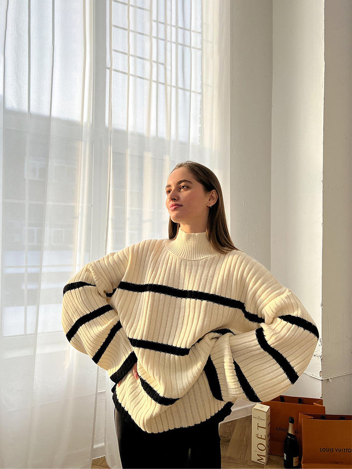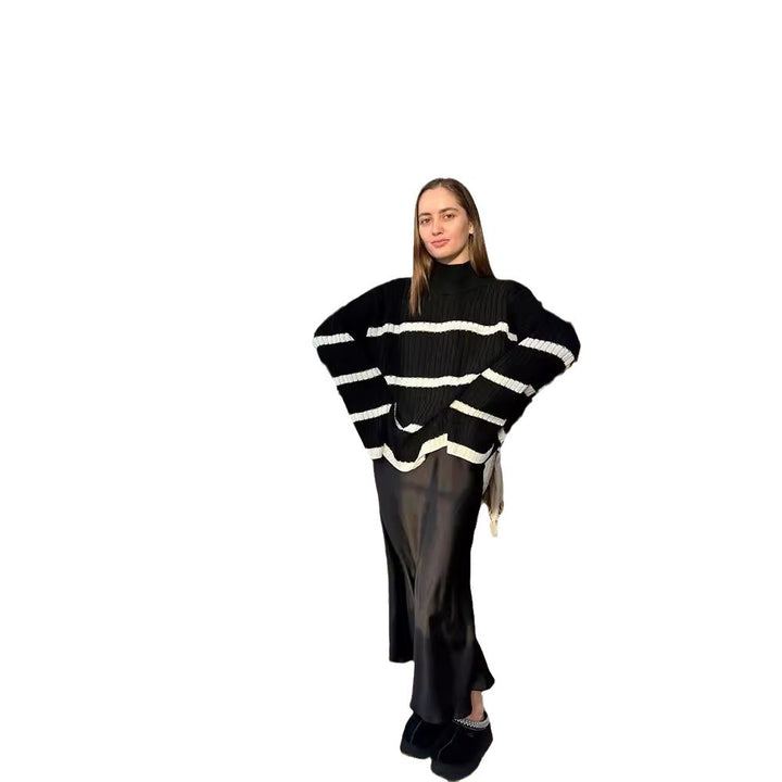 knitted sweater semi-turtleneck pullover top women's autumn and winter stripes contrasting sweater lazy loose top
