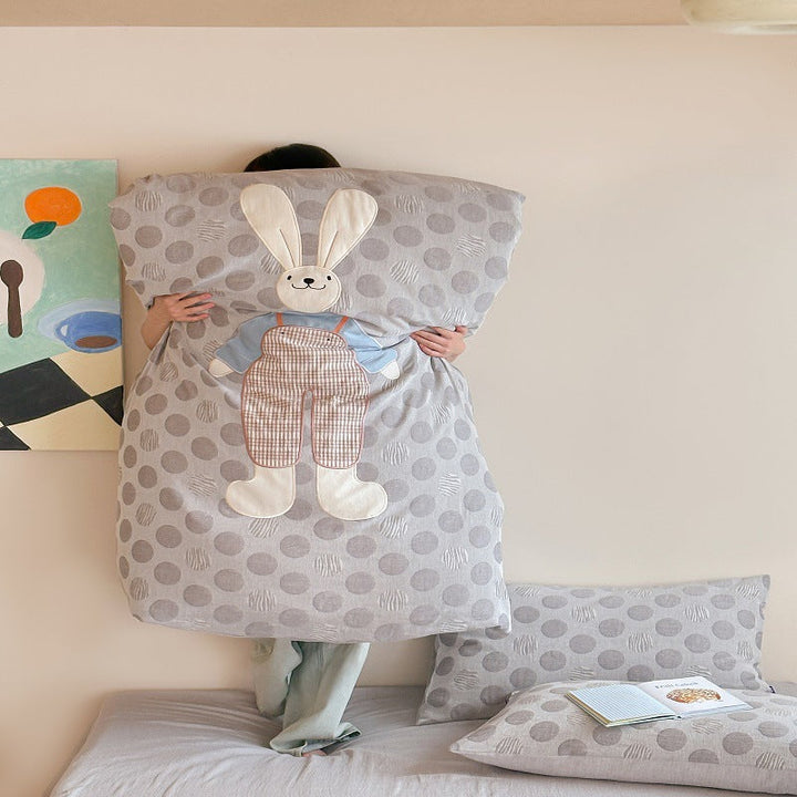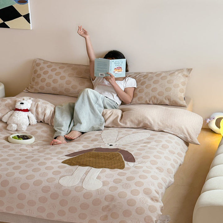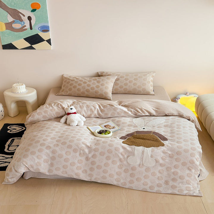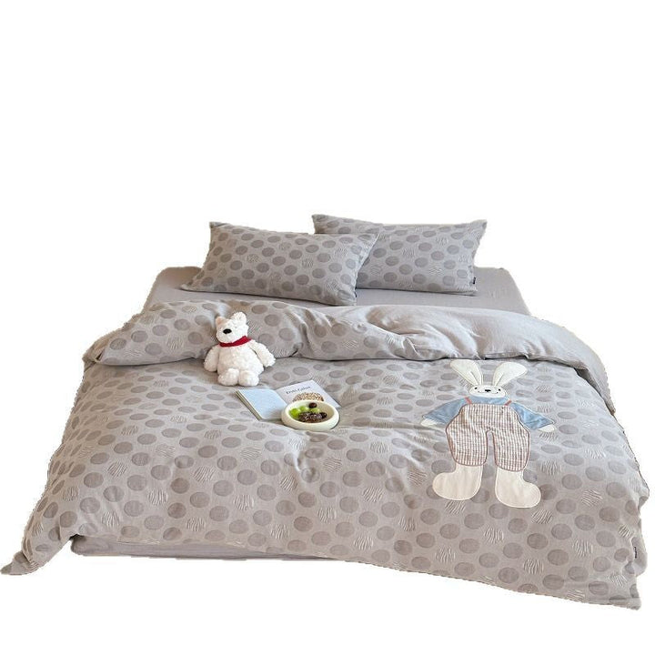 Korean Class A cotton double-layer yarn jacquard three-dimensional sticker embroidery cartoon four-piece set skin-friendly nude bedding quilt cover